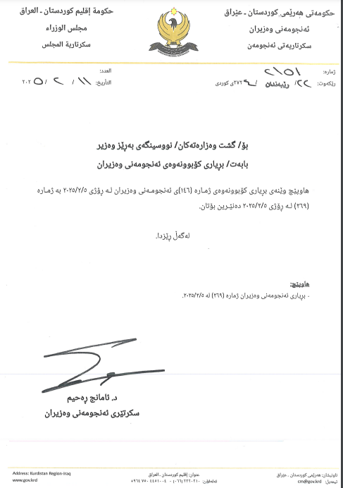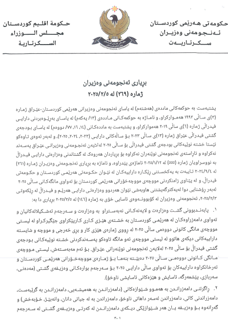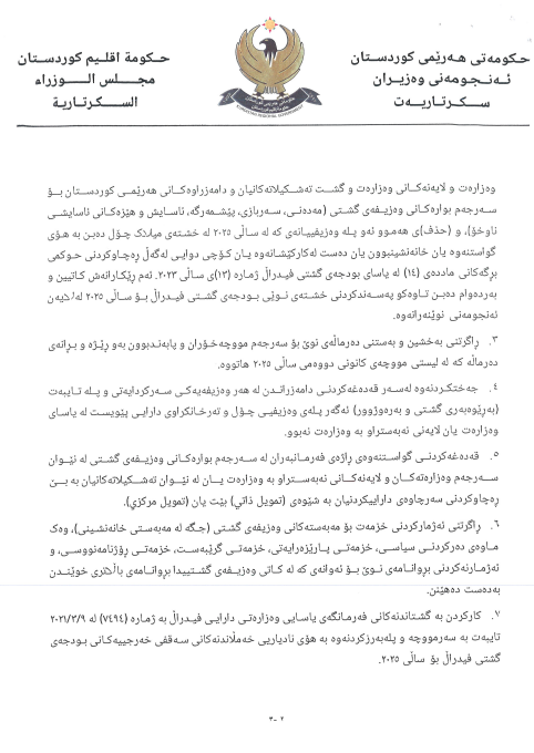بەبەهانەی ئەوەی تائێستا خشتەكانی بودجەی ساڵی 2025 لەلایەن حكومەتی فیدراڵەوە پەسەند نەكراوەو رەوانەی پەرلەمان نەكراوە، حكومەتی هەرێمی كوردستان پاڵپشت بە بڕیاری كۆبوونەوەی رۆژی 5ی ئەم مانگەی ئەنجومەنی وەزیران چەند بڕیارێكی دەركرد، كە دیارترینیان ئەمانەن: