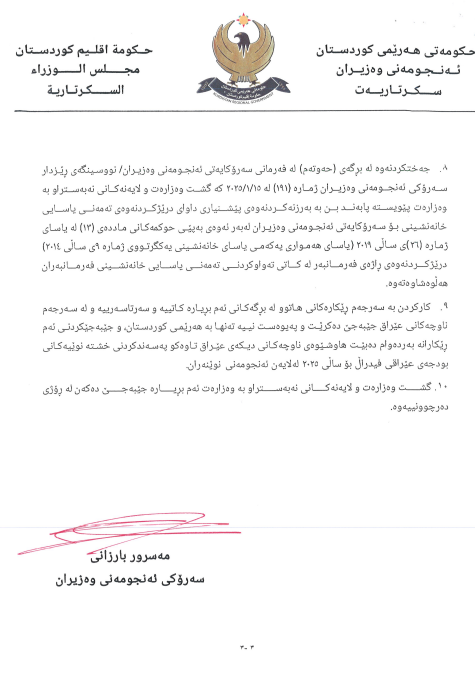 • راگرتنی بەخشین و بەستی دەرماڵەی نوێ بۆ سەرجەم موچەخۆران و پابەندبوون بەو رێژەو بڕانەی دەرماڵە كە لە لیست موچەی كانونی دووەمی 2025دا هاتووە.