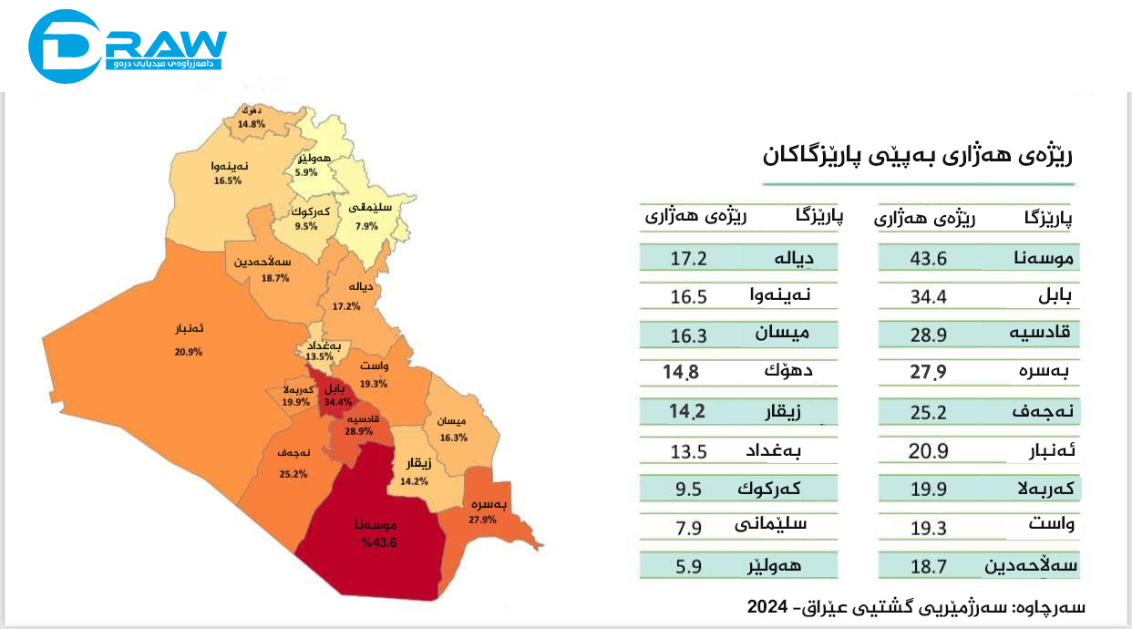 بەپێی ئەنجامی سەرژمێری گشتی عێراق، موسەنا هەژارترین پارێزگای عێراقە بە رێژەی (43.6%) و لە هەرێمی كوردستانیش دهۆك هەژارترین پارێزگایە بەرێژەی (14.8%)، سلێمانی ( 7.9%) و هەولێر ( 5.9%) و بەغدادیش ( 13.3)