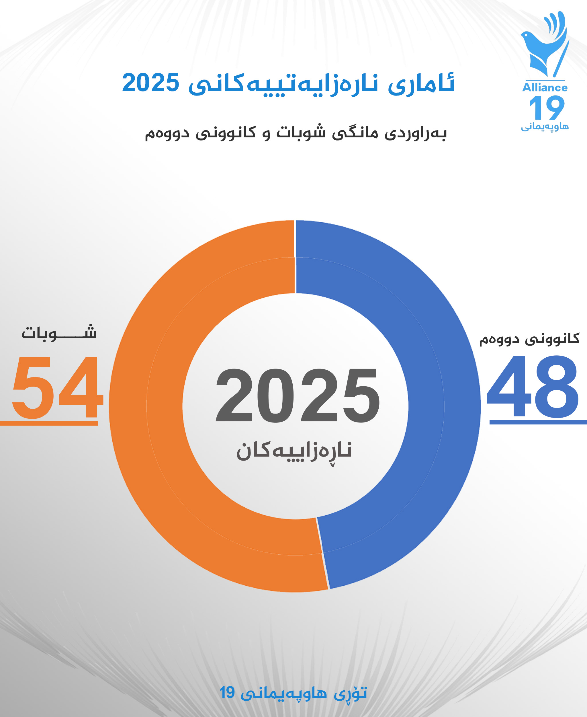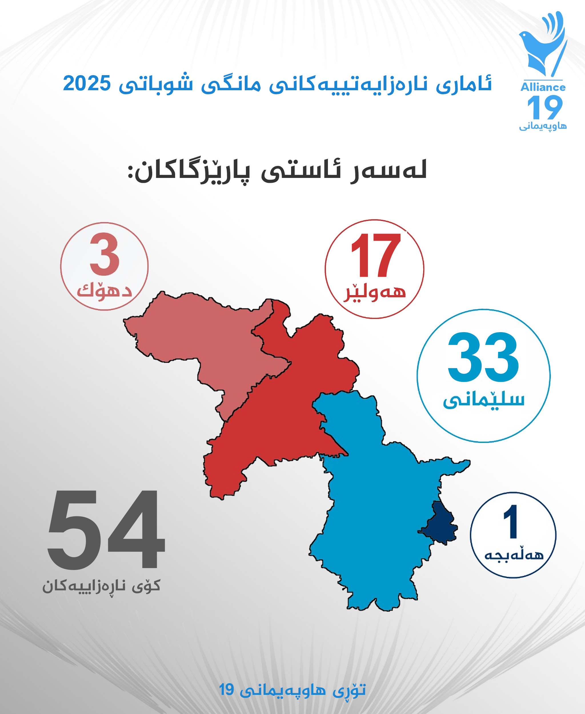 بە پێی بەدواچوونی تۆڕی هاوپەیمانی نۆزدە، 61%ی چالاكییەكان لە پارێزگای سلێمانی، 31% لە پارێزگای هەولێر، 6% ی لە پارێزگای دهۆك، 2%ی لە پارێزگای هەڵەبجە بوون.