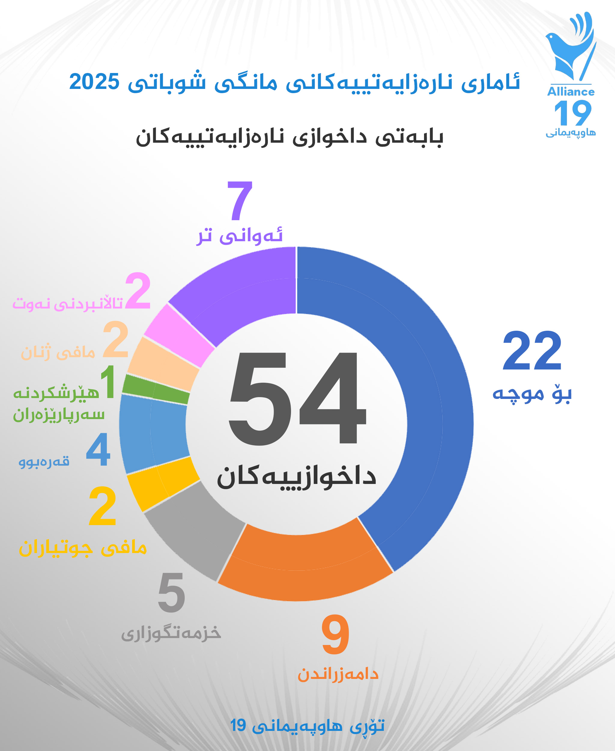 بە پێی چاودێری تۆڕی هاوپەیمانی 19، زۆرترین چالاكی و نارەزایەتی بۆ موچە بوون كە 41%ی كۆی داخوازییەكان بوون و 17% بۆ دامەزراندن و 9%ی داخوازییەكان بۆ خزمەتگوزرای بوون.