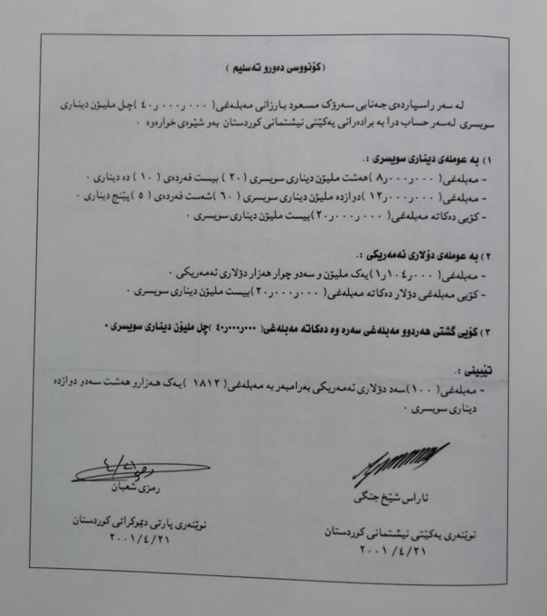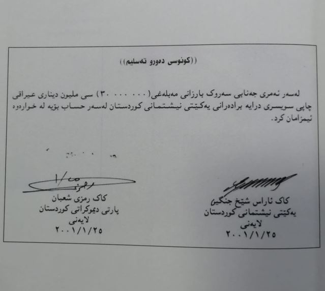 رۆژی 25ی كانونی دووەمی 2001 لەدوای نامەكەی تاڵەبانییەوە بۆ بارزانی، یەكێتیی لەڕێگەی (ئاراس شێخ جەنگیی) بڕی (30 ملیۆن) دیناری سویسری لە (رەمزی شەعبان) وەكو نوێنەری پارتی وەرگرتووە (بارزانی ئەم بەڵگەنامەی لە یادەوەرییەكانی خۆیدا بە ئیمزای ئاراس شێخ جەنگییەوە تۆماركردووە).
