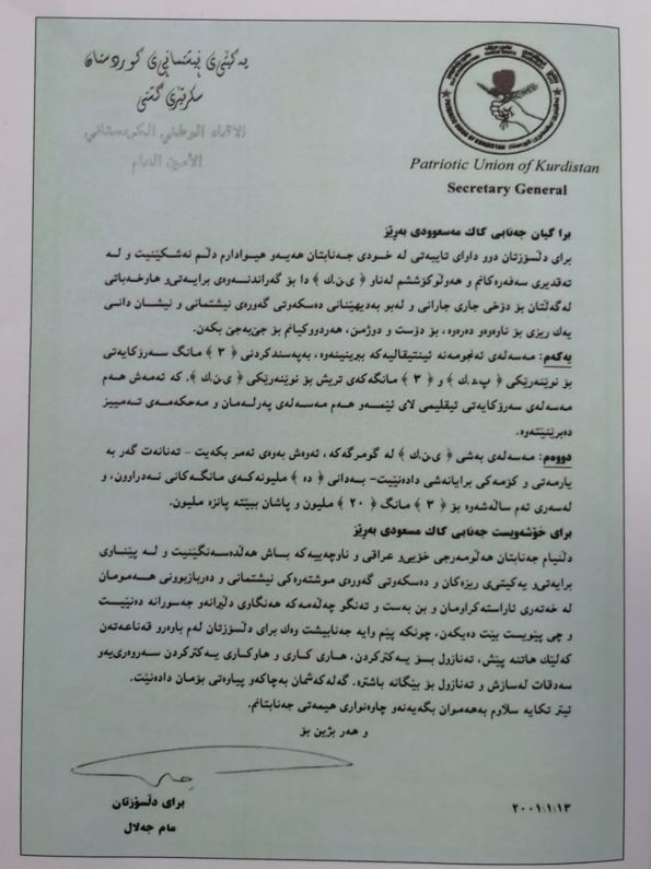 نامەیەكی تاڵەبانی بۆ بارزانی راستی قسەكانی نەوشیروان مستەفا دەسەلمێنێت لەبارەی ئەوەی، لەدوای رێككەوتنی ئاشتییەوە؛ پارتی مانگانەو بەشێوەیەكی رێكخراو پارەی بۆ یەكێتیی نەناردووە.
