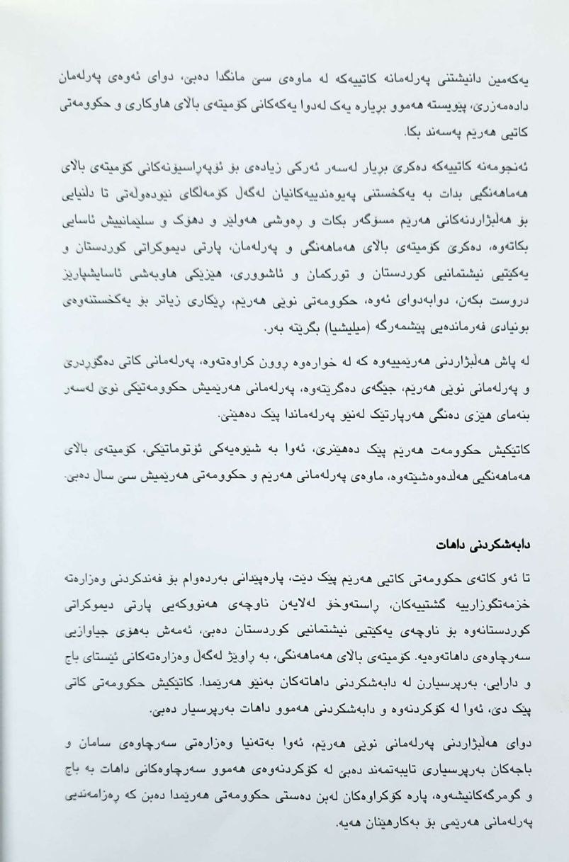 • حكومەتێكی ئیئتیلافی پێكبهێنرێت لەسەر بنەمای (1/3) بۆ پارتی و (1/3) بۆ یەكێتیی و (1/3) بۆ لایەنەكانی تر.