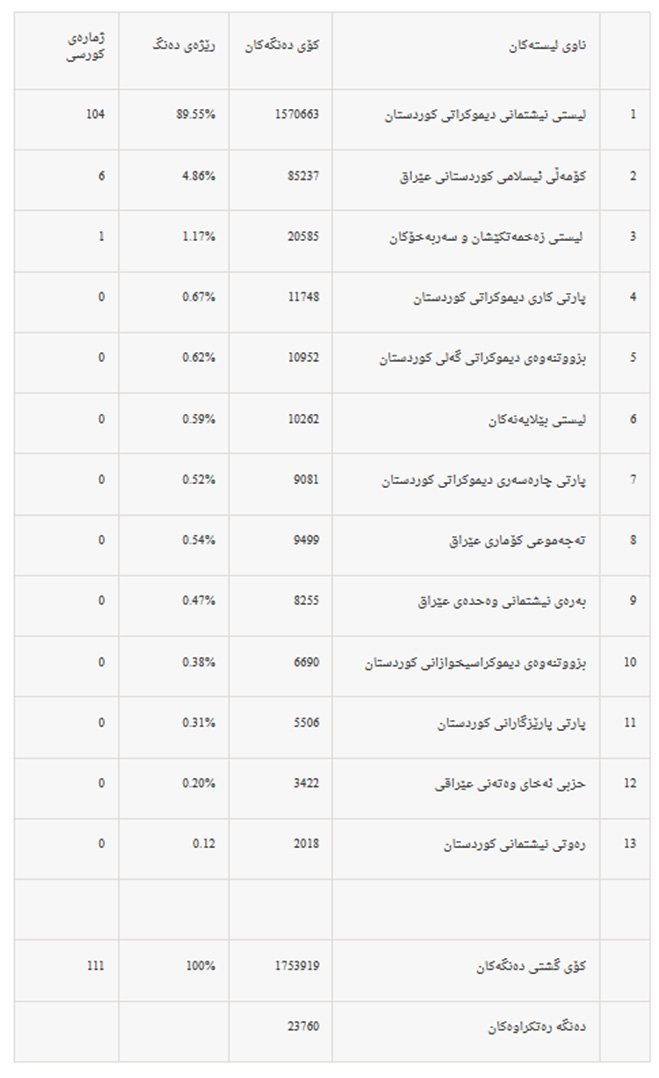 • لیستی نیشتمانی دیموكراتی كوردستان (هاوپەیمانی پارتی+ یەكێتیی+ یەكگرتوو و چەند لایەنێكی تر): 104 كورسی