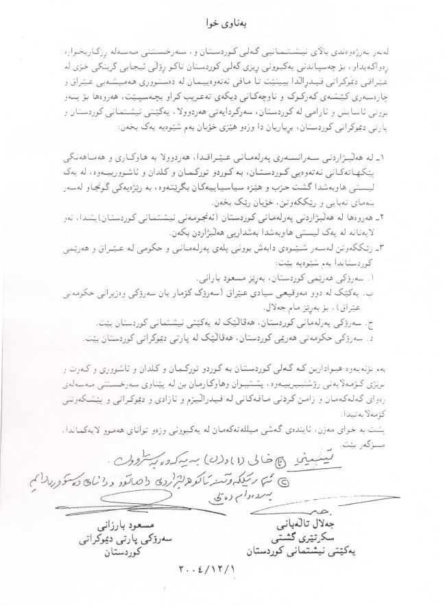 دەقی رێككەوتنەكە كە نەوشیروان مستەفا بڵاویكردوەتەوە