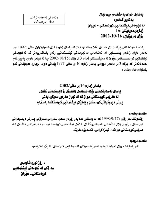 - 8ی حوزەیرانی 2005: پەرلەمان یاسای ژمارەی 1ی (سەرۆكایەتیی هەرێمی كوردستان)ی پەسەندكرد.