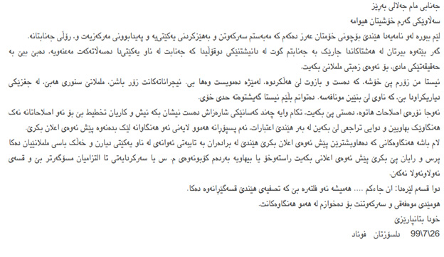 دەقی نامەكەی فوئاد مەعسوم بەوشێوەی كە نەوشیروان مستەفا بڵاویكردوەتەوە