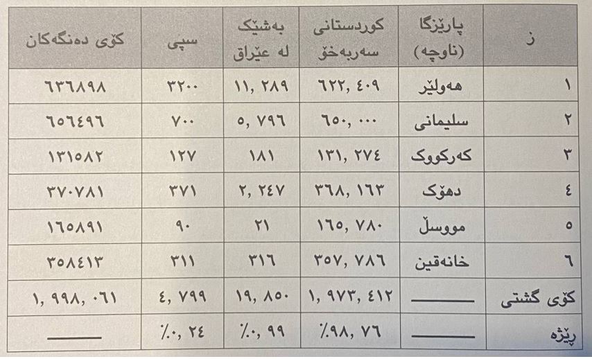 نەوشیروان مستەفا لە درێژەی قسەكانیدا نوسیویەتی: (كۆمیسیۆنی باڵای هەڵبژاردنەكان لە بەغداد بەهۆی تەزویرەوە هەندێ له سنوقەكانی قەزای سۆرانی فت كردوه. بارزانی نامەی ناڕەزایی بۆ حسێن هنداوی سەرۆكی كۆمیسیۆن نوسیوەو سەرۆكی كۆمیسیۆن وەڵامی داوەتەوه). سەرباری ناڕەزایەتییەكە، ئەنجامەكان بەوشێوەی هەبوون تێپەڕین، بارزانیش كە چاوی لە رێككەوتنێكی لاسەنگ بوو لەگەڵ تاڵەبانی بۆ دابەشكردنی پۆستەكانی بەغدادو كوردستان، وەكو ئەنجامی هەڵبژاردنەكەی 1992 نەیكرد بە هەڵاو دۆخەكە تێپەڕی.