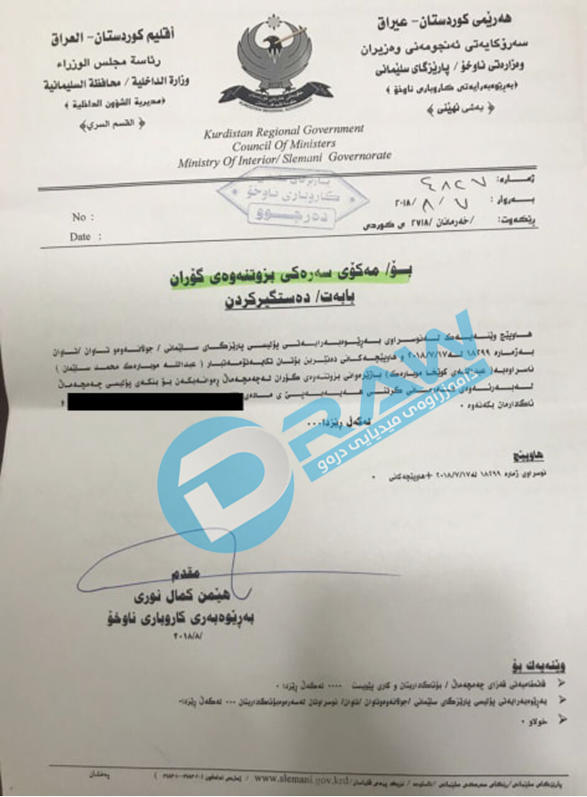بەپێی نوسراوەكەی بەرێوەبەرایەتی پۆلیسی پارێزگای سلێمانی/ جوڵانەوەی تاوان/ تاوان, بە ژمارە ( 18299) لە 17/7/2018 كە بۆ بنكەی پۆلیسی چەمچەماڵ نێردراوە داوای دەستگیركردنی ( عەبدوڵای كوێخا موبارەك) دەكات و نوسراوەكە ئاماژەی بەوەشكردووە باژێروانی مەكۆی چەمچەماڵی بزوتنەوەی گۆڕان, لەبەرئەوەی فەرمانی دەستگیكردنی هەیە, دەستگیری بكەن.