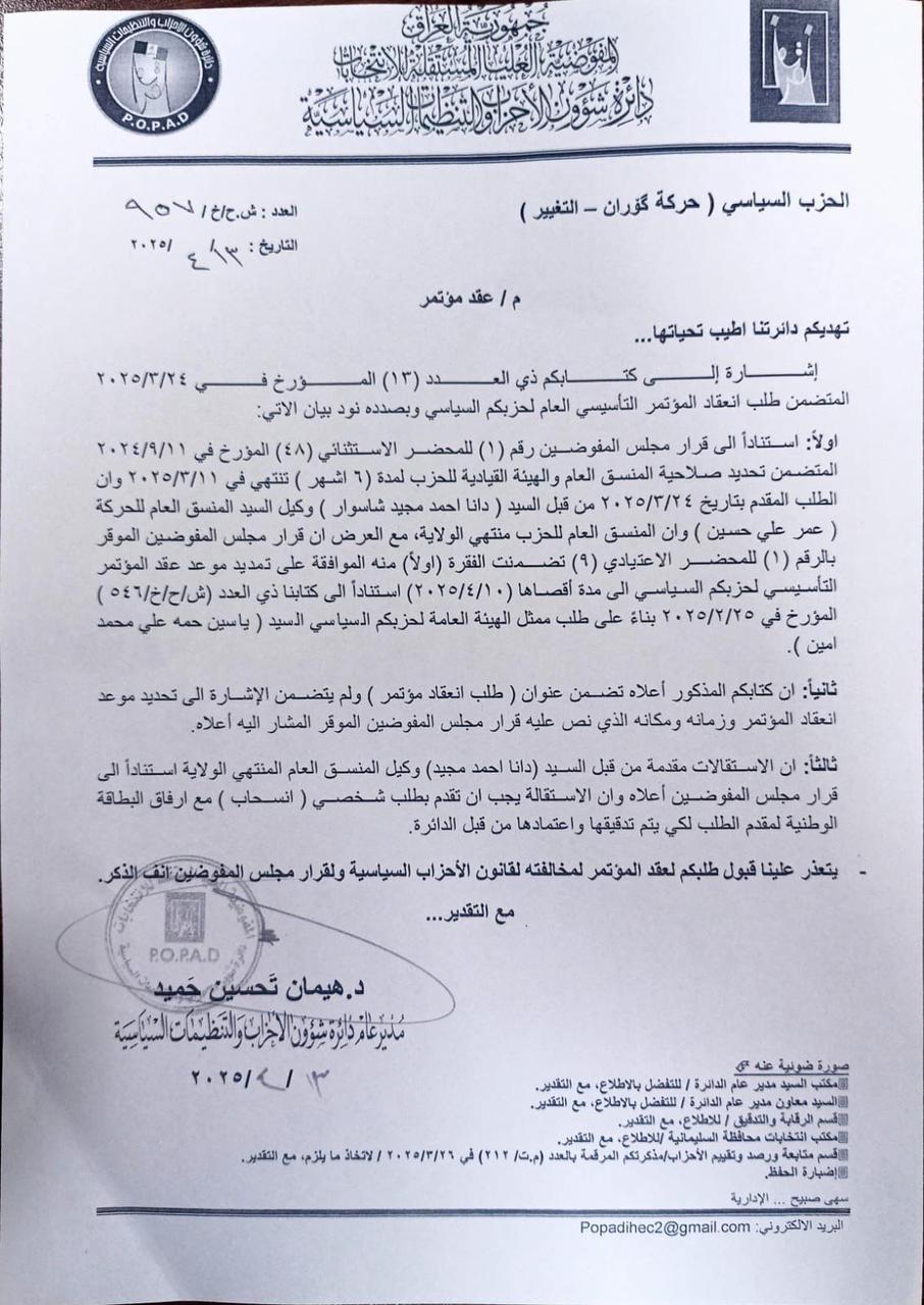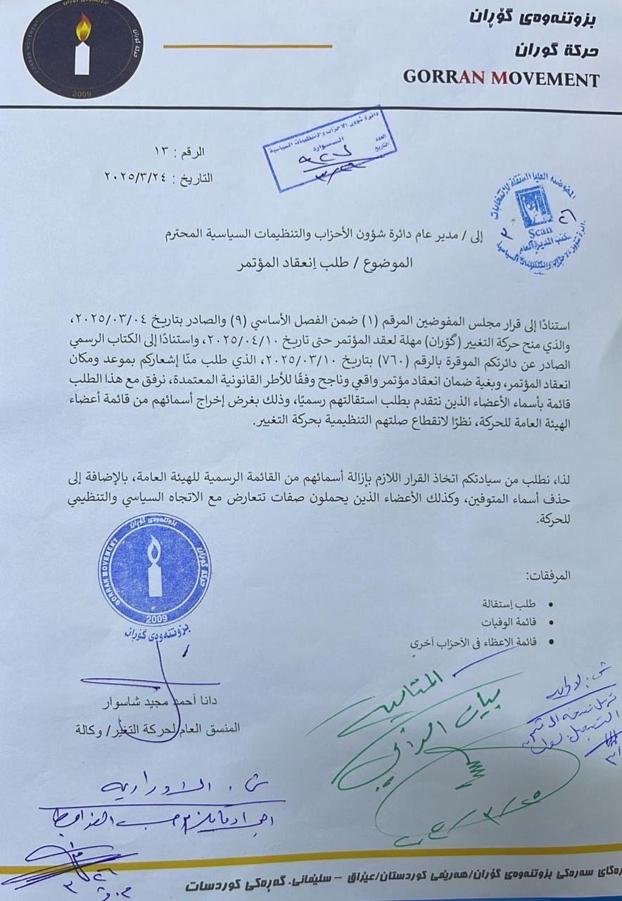 *داواكهی دانا ئهحمهد مهجید بریكاری رێكخهری گشتی بزووتنهوهكه (عومهر عهلی حسێن) له 24/3/2025 له كاتێكدایه كه رێكخهری گشتی حزب ماوهی بهسهرچووه.