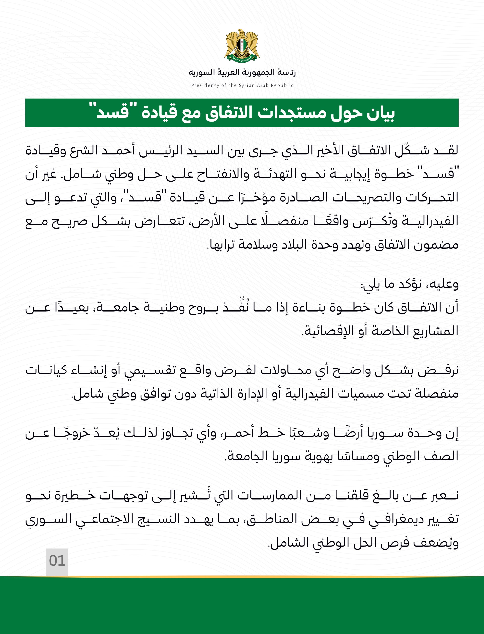 سەرۆكایەتیی كۆماری سوریا بەیاننامەیەكی لەبارەی نوێترین پەرەسەندنەكانی رێككەوتنەكەی لەگەڵ هێزەكانی سوریای دیموكرات (هەسەدە) لە رۆژئاوای كوردستان بڵاوكردەوە.