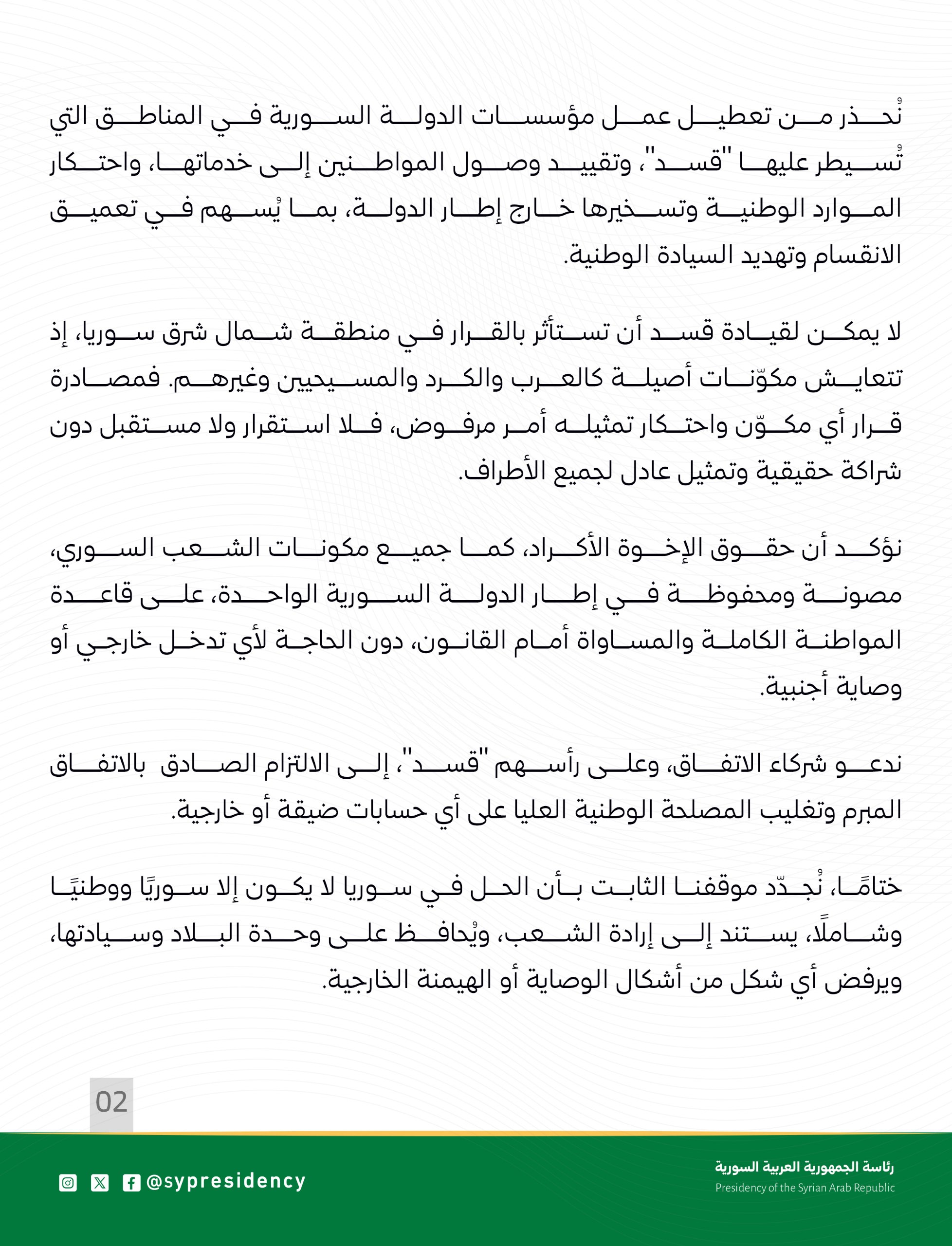 لەم بەیاننامەیەدا، سەرۆكایەتیی سوریا نیگەرانی خۆی لە گۆڕینی دیموگرافیا لە هەندێك ناوچە نیشان دەدات، هۆشداری دەدات لە پەكخستنی كاری دامەزراوەكانی دەوڵەت لەو ناوچانەی كە لەژێر كۆنترۆڵی هێزەكانی سوریای دیموكراتدان. بەبێ ئەوەی ناو بهێنێت، باسلەوە دەكات، مافی گەلی كورد لەچوارچێوەی یەك دەوڵەتی سوریادا پارێزراو دەبێت لەسەر بنەمای هاوڵاتیبوون و یەكسانی لە ئەرك و مافدا، بەبێ دەستوەردانی دەرەكیی، داوا لە (هەسەدە) دەكات پابەند بێت بە رێككەوتنەكەیەوە.
