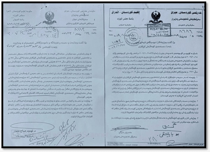 ئاماژە بە فەرمانێک دەکات کە لە ساڵی 2019 لەلایەن ئەنجوومەنی وەزیرانی هەرێمی کوردستانەوە دەرچووە و تیایدا جەخت لەوە کراوەتەوە کە هیچ خاوەنکارێک لە هیچ کەرتێکدا، بەتایبەتی کۆمپانیاکان، نابێت هیچ مامەڵەیەک تەواو بکات، مەگەر ڕەزامەندی لە بەشی دەستەبەری کۆمەڵایەتی بۆ کرێکاران وەرنەگرتبێت.