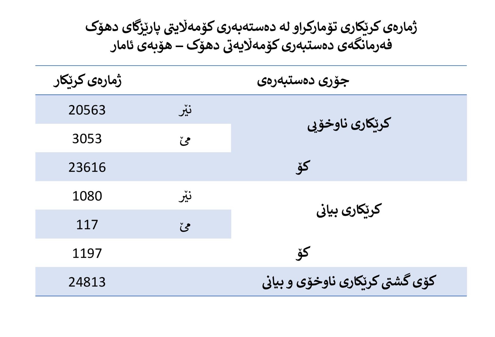 ? بەپێی ئامارێکی یەکێتی سەندیکاکانی کوردستان - لقی دهۆک، ژمارەی کرێکارانی پارێزگاکە لە کەرتی تایبەتدا دەگاتە (120) هەزار کەس کە (11 هەزار) کرێکاری بیانین (90%)یان لە سوریاوە هاتوون. تەنها (20%)ی کۆی هێزی کار دەستەبەری کۆمەڵایەتی دەیانگرێتەوە.