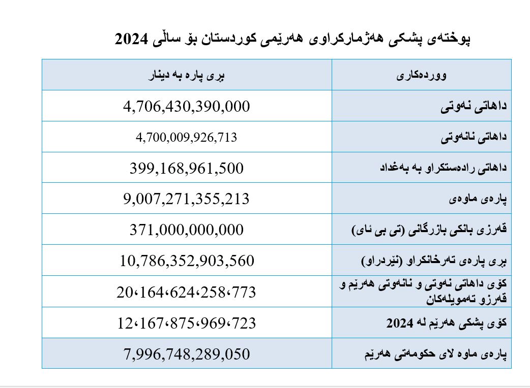 لە ساڵی 2024: كۆی داهاتەكانی بەردەستی حكومەتی هەرێم: 20 ترلیۆن و 164 ملیار دیناربووە