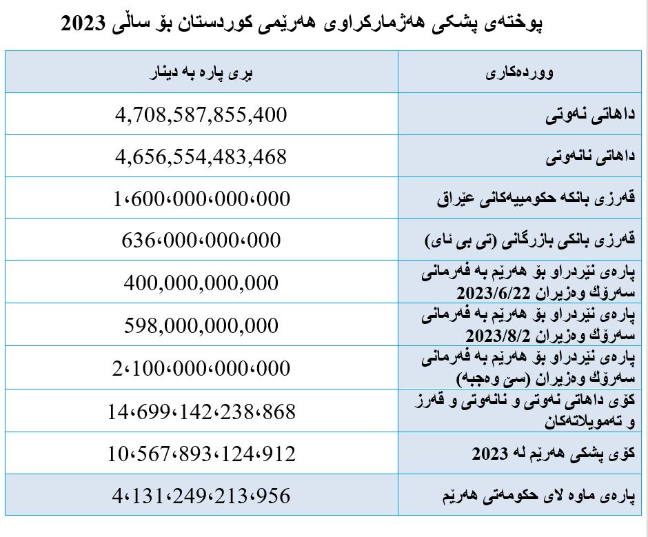 • كۆی داهاتی نەوتی و نانەوتی و قەرز و تەمویلاتەكان بۆ حكومەتی هەرێم لە 2023 دا: (20 ترلیۆن و 164 ملیارو 624 ملیۆن و 258 هەزار) دینار