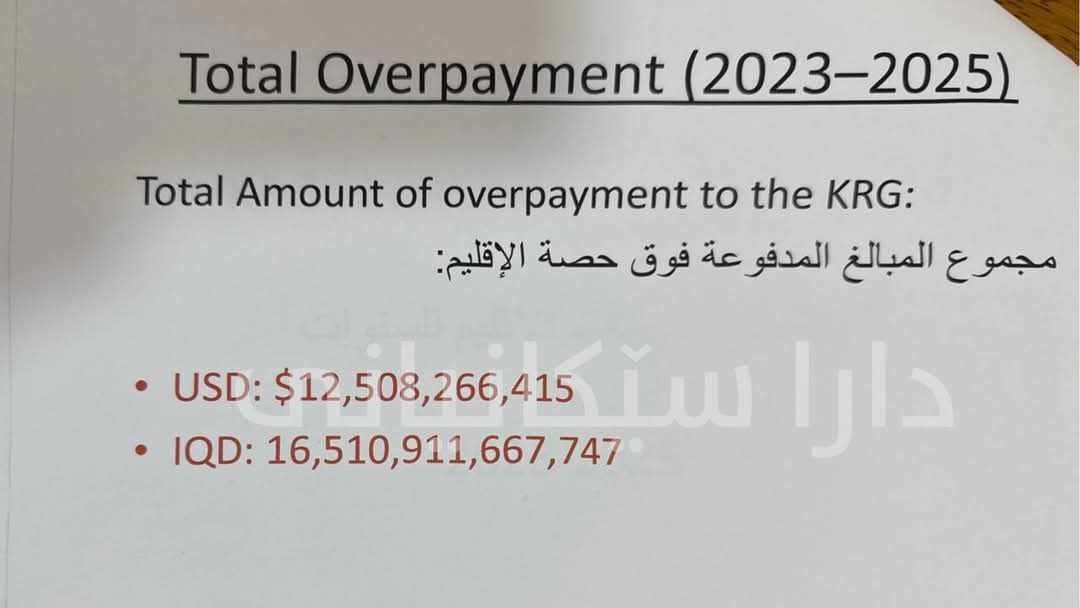 بە گوێرەی كۆمەڵێك بەڵگەنامەی حكومەتی عێراق، كە (پوختەی حساباتەكانی هەرێمی كوردستانی لە نێوان ساڵانی 2023-2025) تیادا تۆماركراوەو، لەلایەن دارا سێكانیانی، پەرلەمانتاری فراكسیۆنی یەكگرتوو ئیسلامی كوردستان، لە پەرلەمانی عێراق بڵاوكراوەتەوە: