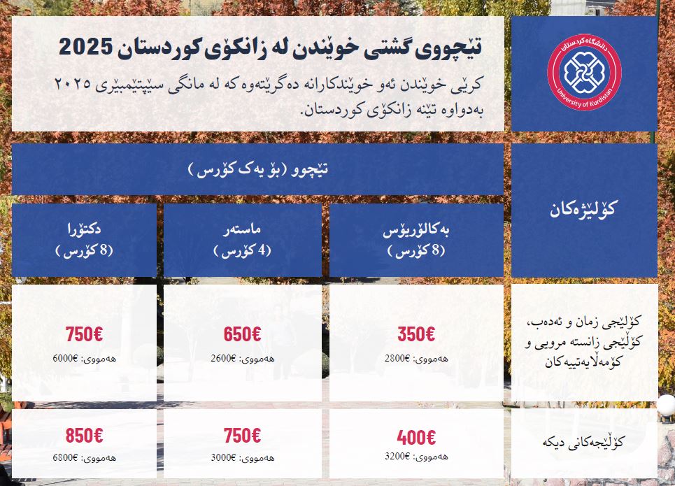 • كرێی خوێندنی سمستەرێكی دكتۆرا بۆ ساڵێك (650) دۆلار بوو ئێستا كراوە بە (750) یۆرۆ.