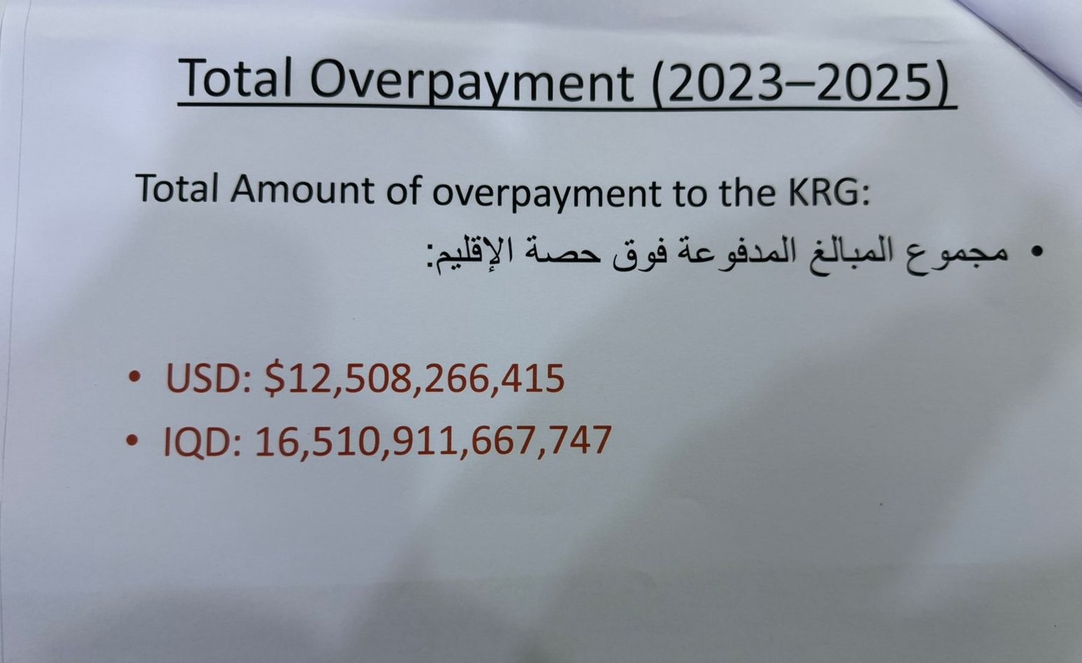 بە گوێرەی كۆمەڵێك بەڵگەنامەی حكومەتی عێراق، كە (پوختەی حساباتەكانی هەرێمی كوردستانی لە 2023- نیسانی 2025) تیادا تۆماركراوە، لەلایەن دارا سێكانیانی ئەندامی لیژنەی یاسایی پەرلەمانی عێراق بڵاوكراوەتەوە، كۆی ئەو بڕە پارەیەی لەوماوەیەدا، رادەستی هەرێمی كوردستان كراوە لەسەرو پشكی خۆیەوە 12) ملیارو 508 ملیۆن و266) دۆلار بووە.