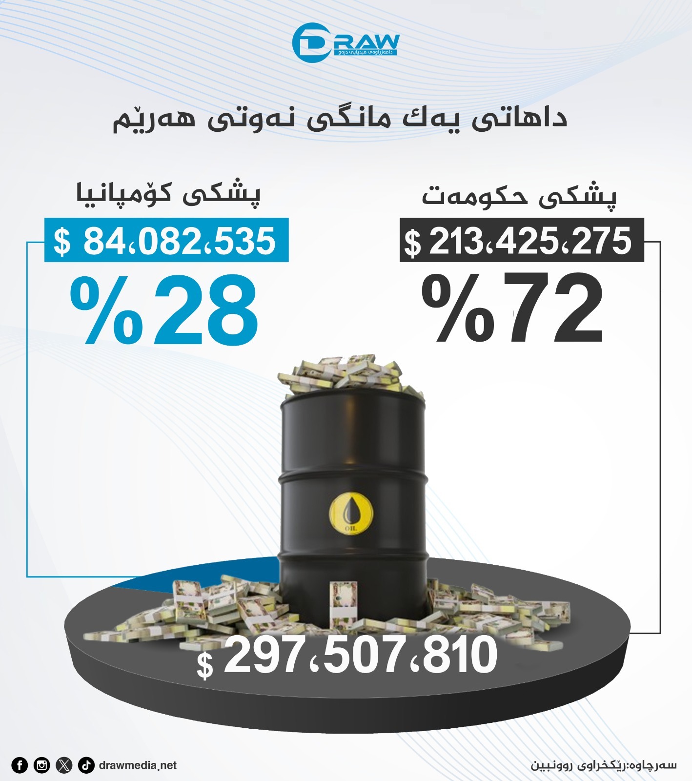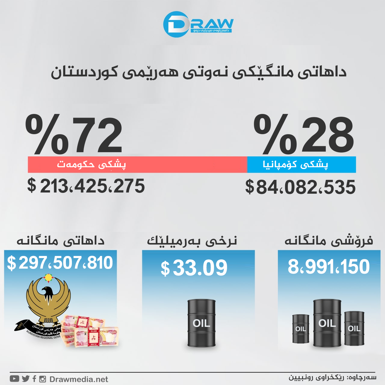 ? مانگانە کۆی داهاتی نەوتی فرۆشراوی هەرێم دەگاتە سەروو (297 ملیۆن 507 هەزار) دۆلار، لەو داهاتەش بە تێکڕا (72%)ی پشکی حکومەتی هەرێم و (28%) پشکی کۆمپانیاکانە.