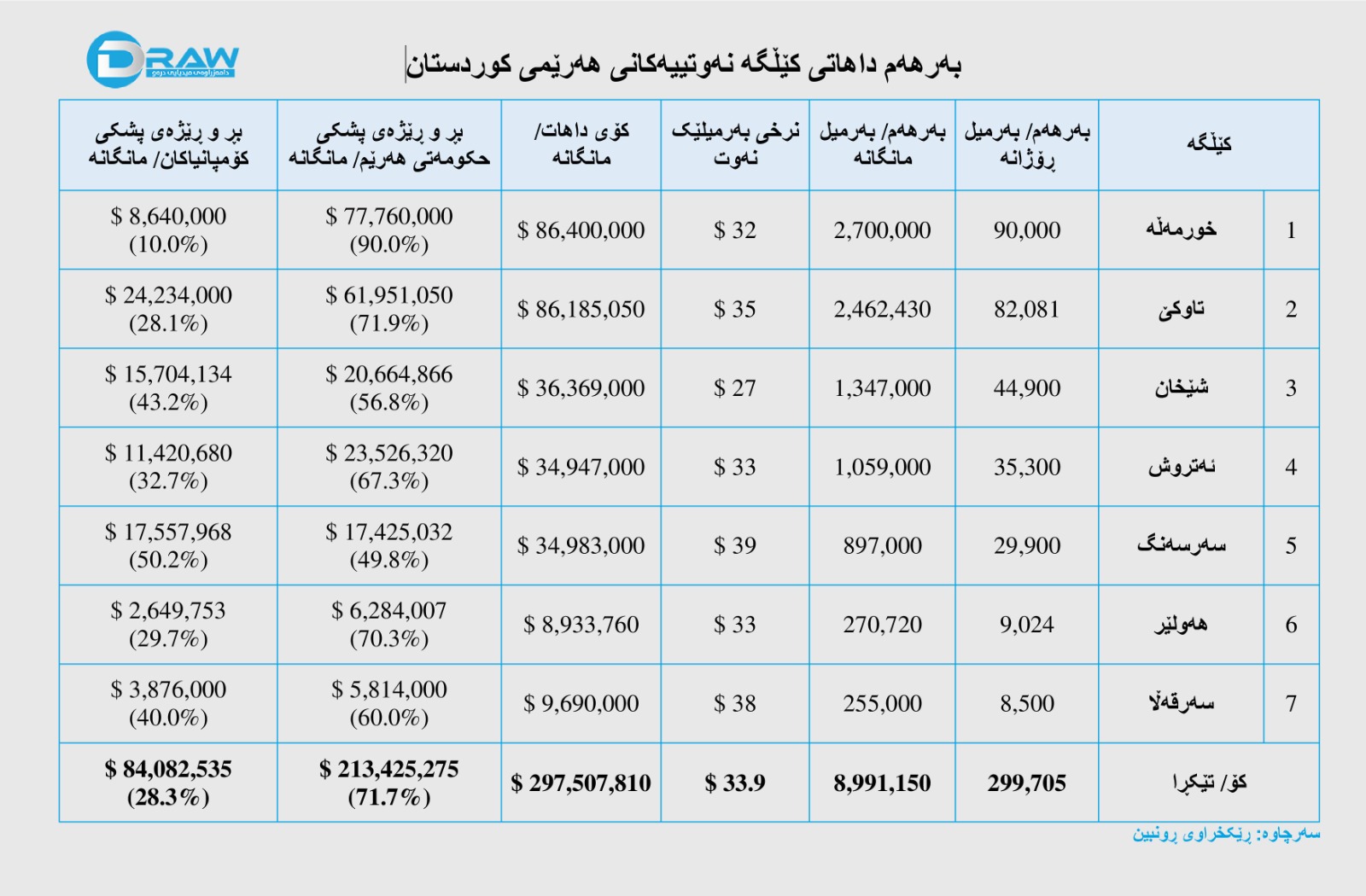 ئەم خشتەیەی خوارەوە ئاستی بەرهەمی رۆژانەو مانگانە (مانگێک ٣٠ رۆژ دانراوە) و نرخ و داهات و پشکی حکومەت و کۆمپانیانی هەرکێڵگەیەک بەجیا ڕونکراوەتەوە.