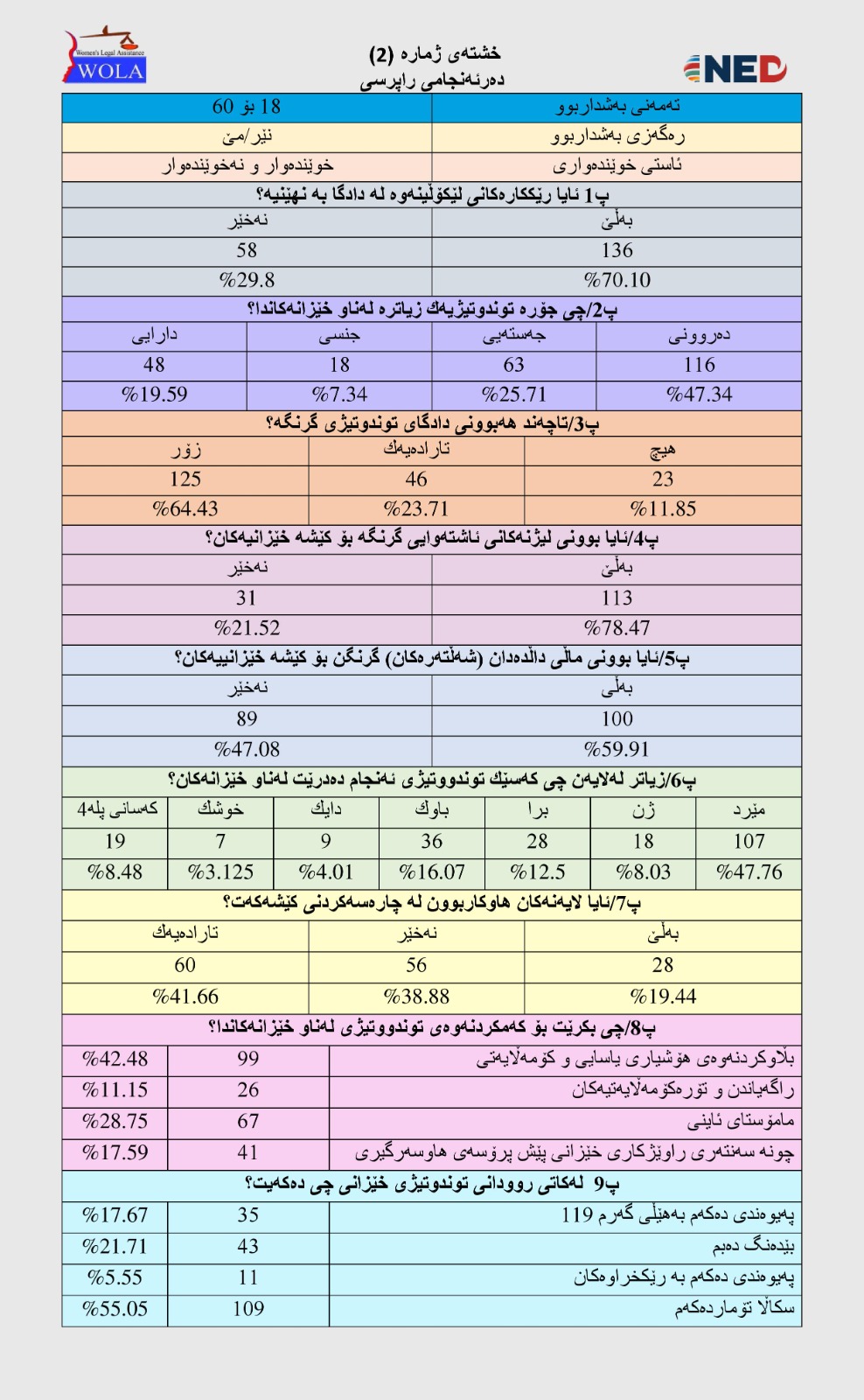 لەكۆتایشدا ئاماری تایبەت بە كێشە خێزانیەكان و راپرسی تایبەت لەسەر یاساكە و راسپاردەو پێشنیار بۆ لایەنە پیەوەندیدارەكان و بۆ رای گشتی خرانەروو.