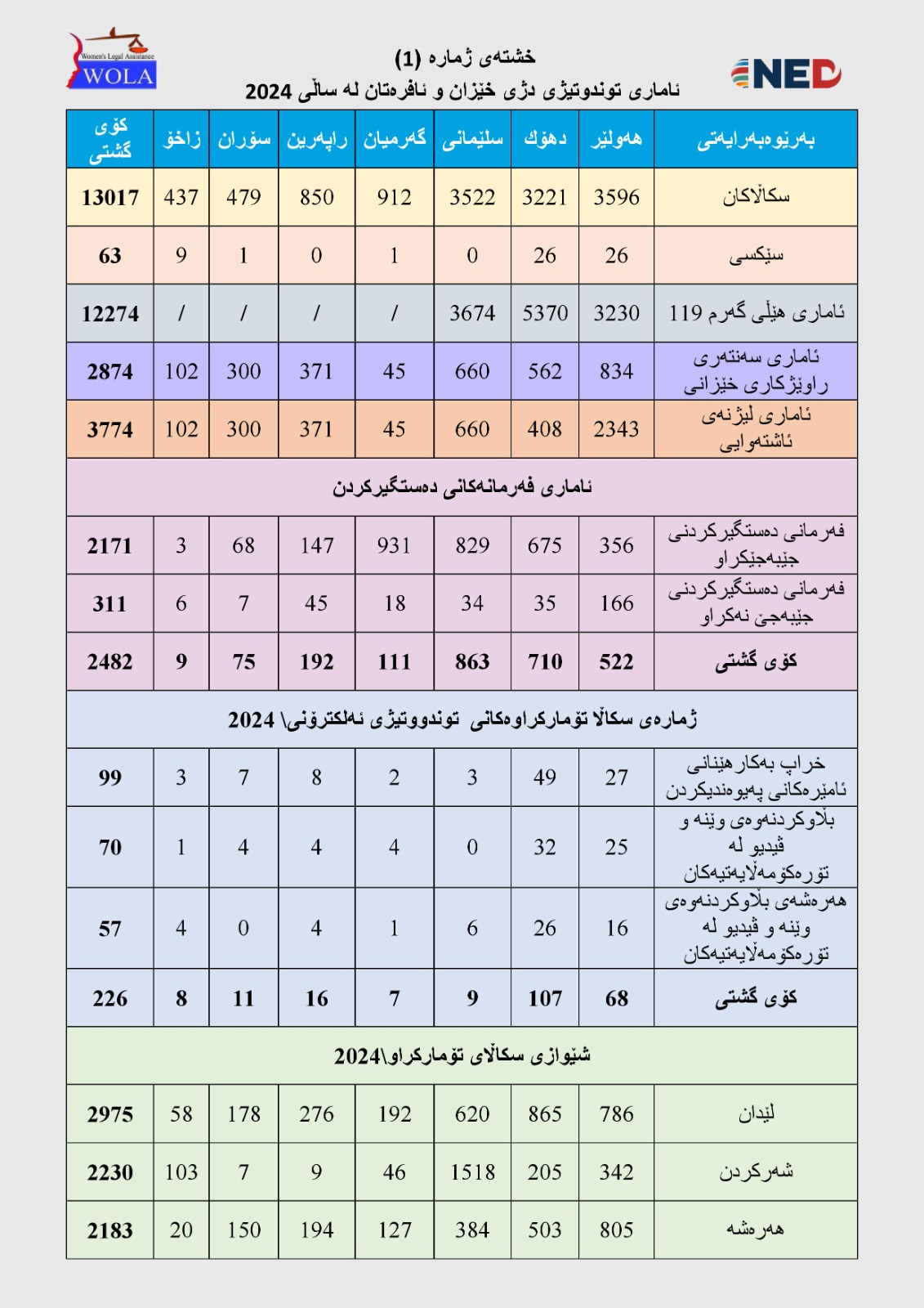 ? بەپێی داتاکانی رێكخراوی هاریكاری یاسایایی ژنان (WOLA) ئەو سکاڵایانەی لە بەڕێوەبەرایەتییەکانی بەرەنگاربوونەوەی توندوتیژی دژی خێزان و ئافرەتان لە ساڵی (2024) لە هەرێمی کوردستان تۆمارکراون ژمارەیان (13 هەزار و 17) سکاڵایە بەم جۆرە؛