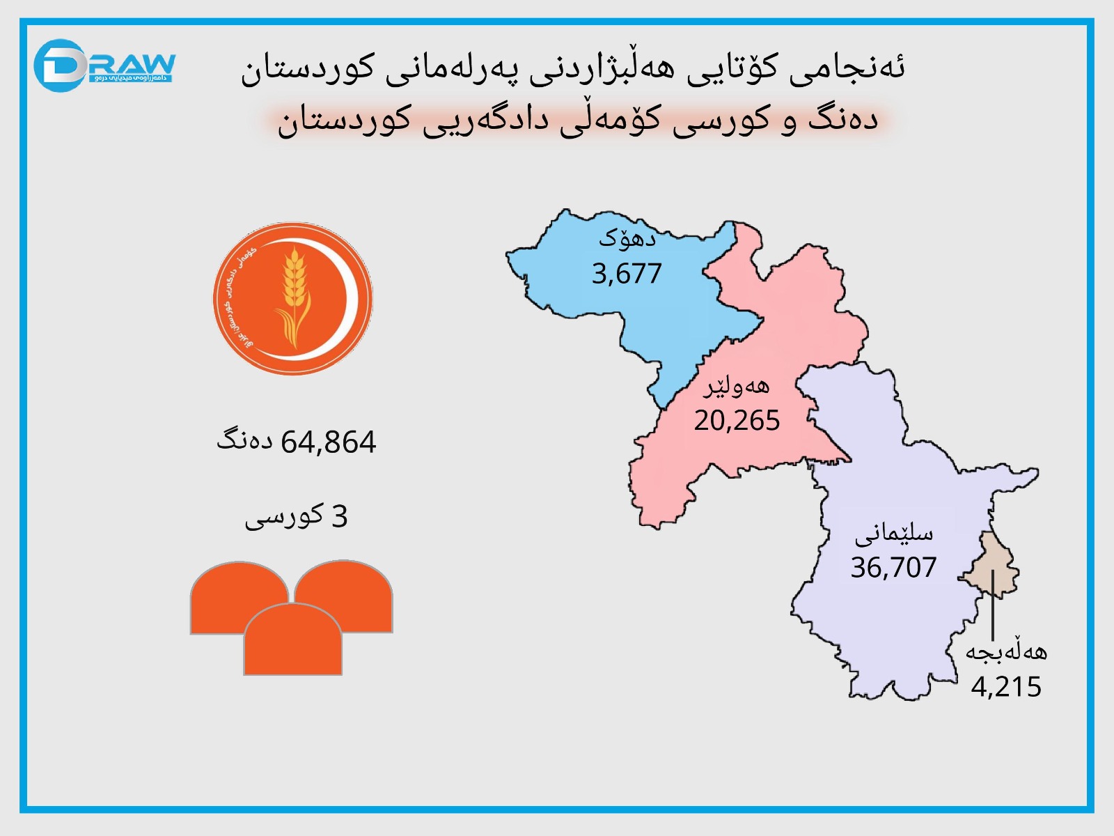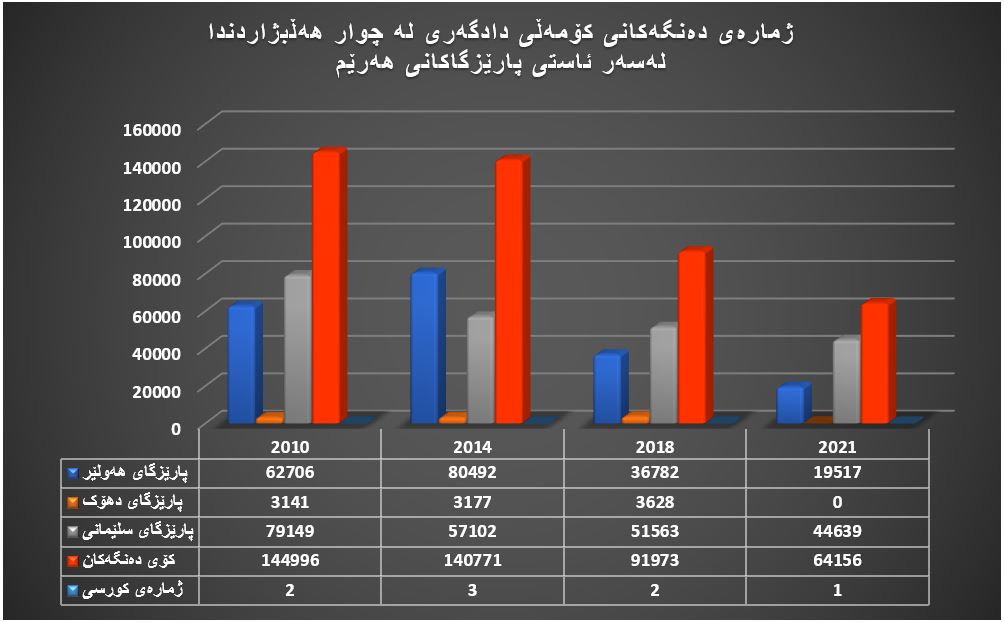 • كۆمەڵی دادگەری كوردستان لە هەڵبژاردنی پەرلەمانی عێراق لە 2021دا (64 هەزارو 156) دەنگ و (1) كورسی بەدەستهێنا