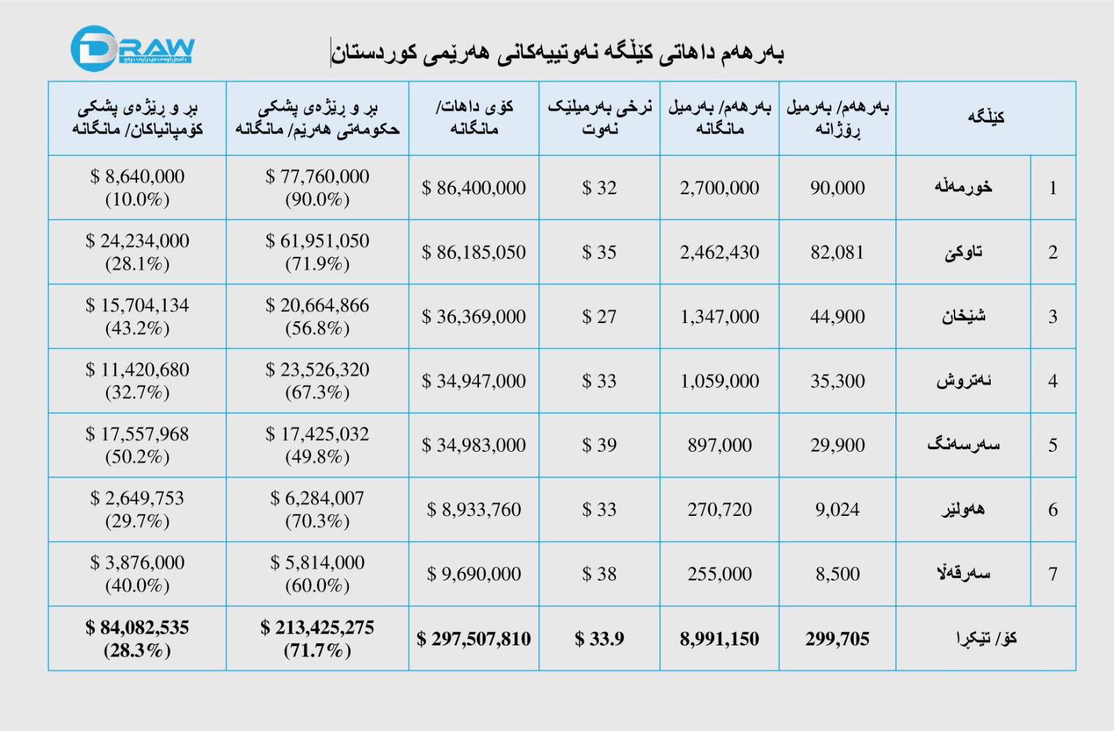 مانگانە کۆی داهاتی نەوتی فرۆشراوی هەرێم دەگاتە سەروو (297 ملیۆن 507 هەزار) دۆلار، لەو داهاتەش بە تێکڕا (72%)ی پشکی حکومەتی هەرێم و (28%) پشکی کۆمپانیاکانە، خشتەکەی خوارەوە وردەکاری بەرهەم و داهاتی کێڵگەکان ڕوندەکاتەوە.