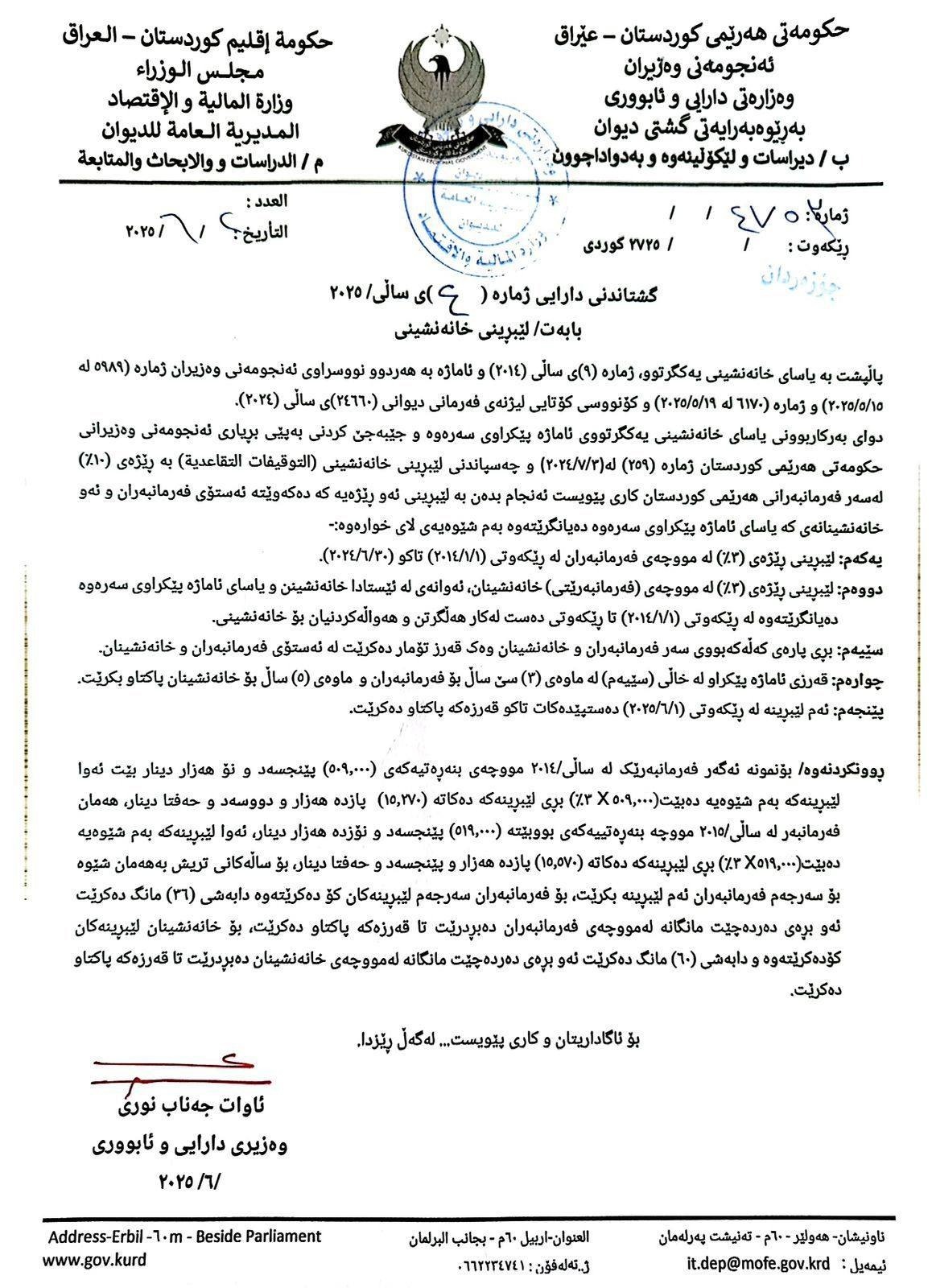 رێنمایى ژمارە (4)ى سالى 2025 وەزارەتى دار ایى و ئابوورى هەرێم