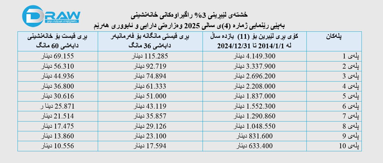 - هەر فەرمانبەرێکی پلە (3) بڕی (2 ملیۆن و 696 هەزار و 200) دینار قەرزی لەسەر هەژمار کراوە دەبێت لە ماوەی (36) مانگدا قەزرەکەی پاکتاو بکات و مانگانە (74 هەزار و 894) دینار لە موچەکەی دەبڕێت، ئەگەر خانەنشینیش بووبێت دەبێت لە ماوەی (60) مانگدا قەزرەکەی پاکتاو بکات و مانگانە (44 هەزار و 936) دینار لە موچەکەی دەبڕێت.