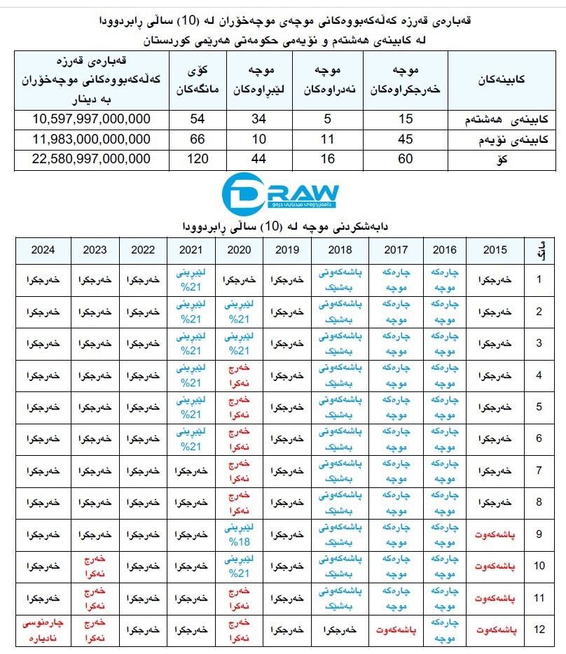 - هەر فەرمانبەرێکی پلە (10) بڕی (633 هەزار و 400) دینار قەرزی لەسەر هەژمار کراوە دەبێت لە ماوەی (36) مانگدا قەزرەکەی پاکتاو بکات و مانگانە (17 هەزار 594) دینار لە موچەکەی دەبڕێت، ئەگەر خانەنشینیش بووبێت دەبێت لە ماوەی (60) مانگدا قەزرەکەی پاکتاو بکات و مانگانە (10 هەزار و 556) دینار لە موچەکەی دەبڕێت.