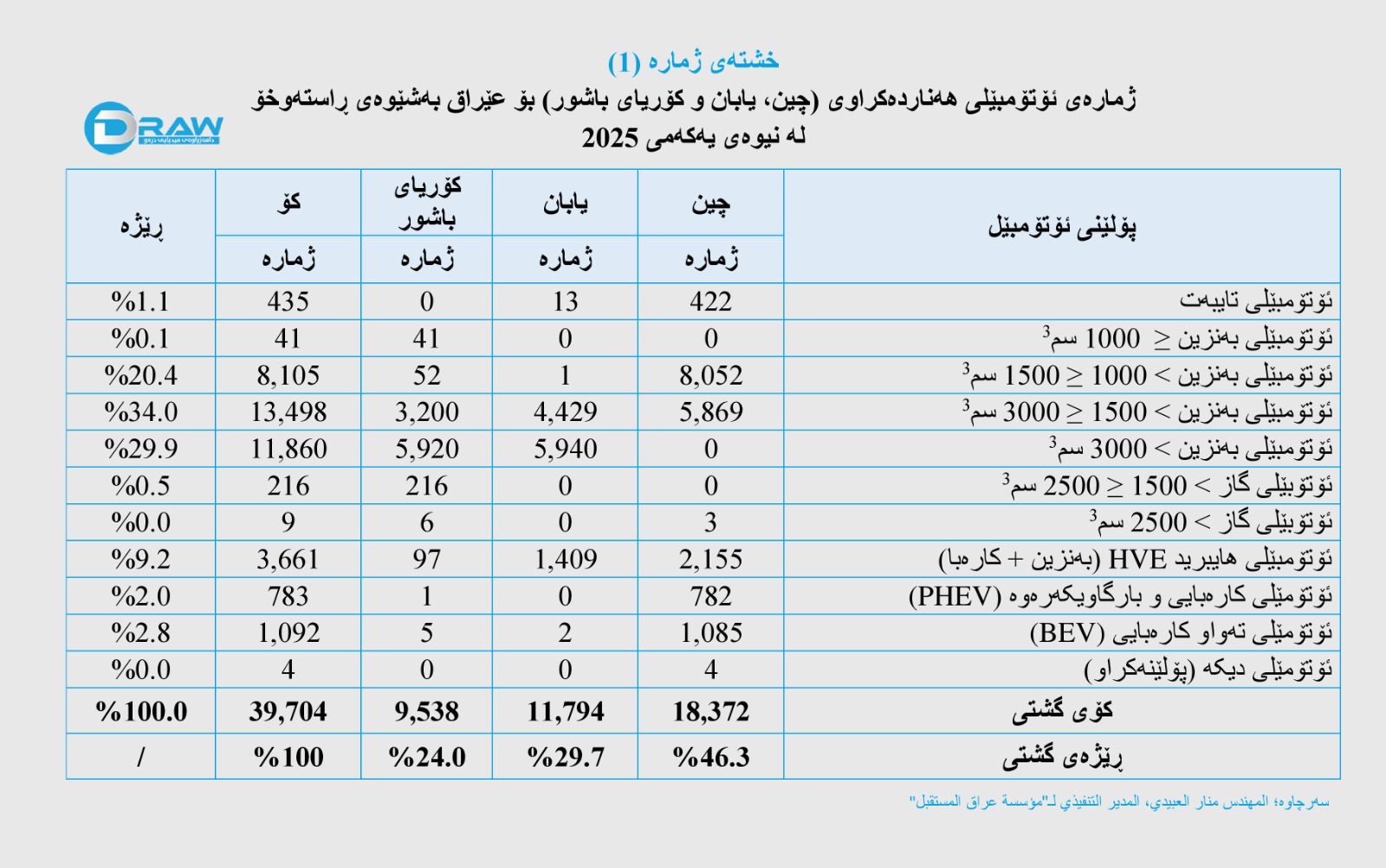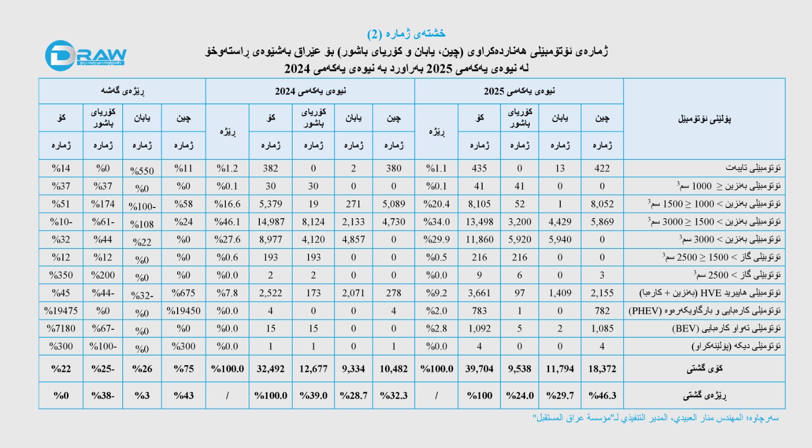 خشتەکانی خوارەوە هەناردەی ڕاستەوخۆی ئۆتۆمبێلی وڵاتانی (چین، یابان و کۆریان) بۆ عێراق دەردەخات، لەماوەی نیوەی یەکەمی (2025) بەراورد بە هەمان ماوەی ساڵی ڕابردوو.
