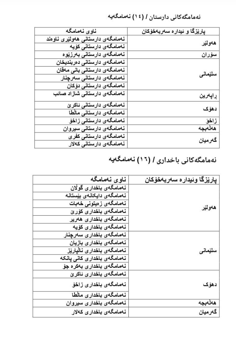 ناو و ناونیشانی نەمامگەی تایبەت بە (باخداری) حکومییەکان لە شاروشارۆچکەکانی هەرێمی کوردستان.