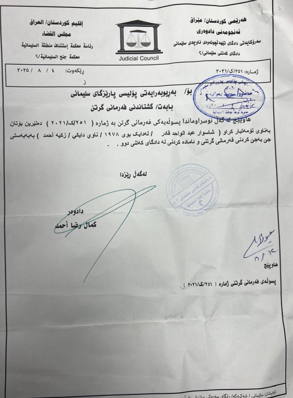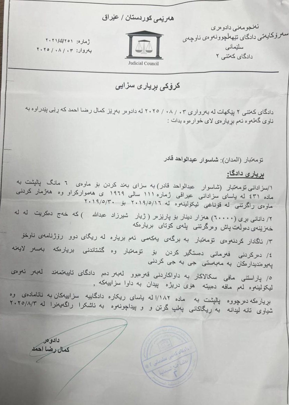 - بەپێی نوسراوێكی دادگای سلێمانی شاسوار عەبدولواحید لە رۆژی 3/8/2025 شەش مانگ سزای بەندكردنی بۆ درەچووە، دادگا فەرمانی كردووە دەستگیربكرێت.