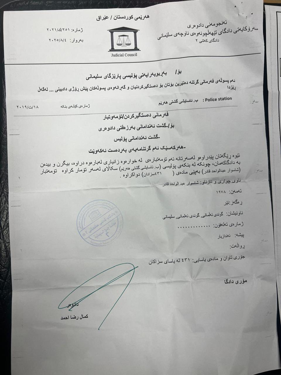 - بەپێی نوسراوێكی تر لەسەر سكاڵای بەرپرسێكی ئاساییشی سلێمانی سكاڵای لەسەر تۆماركراوەو فەرمانی دەستگیركردنی هەیە.