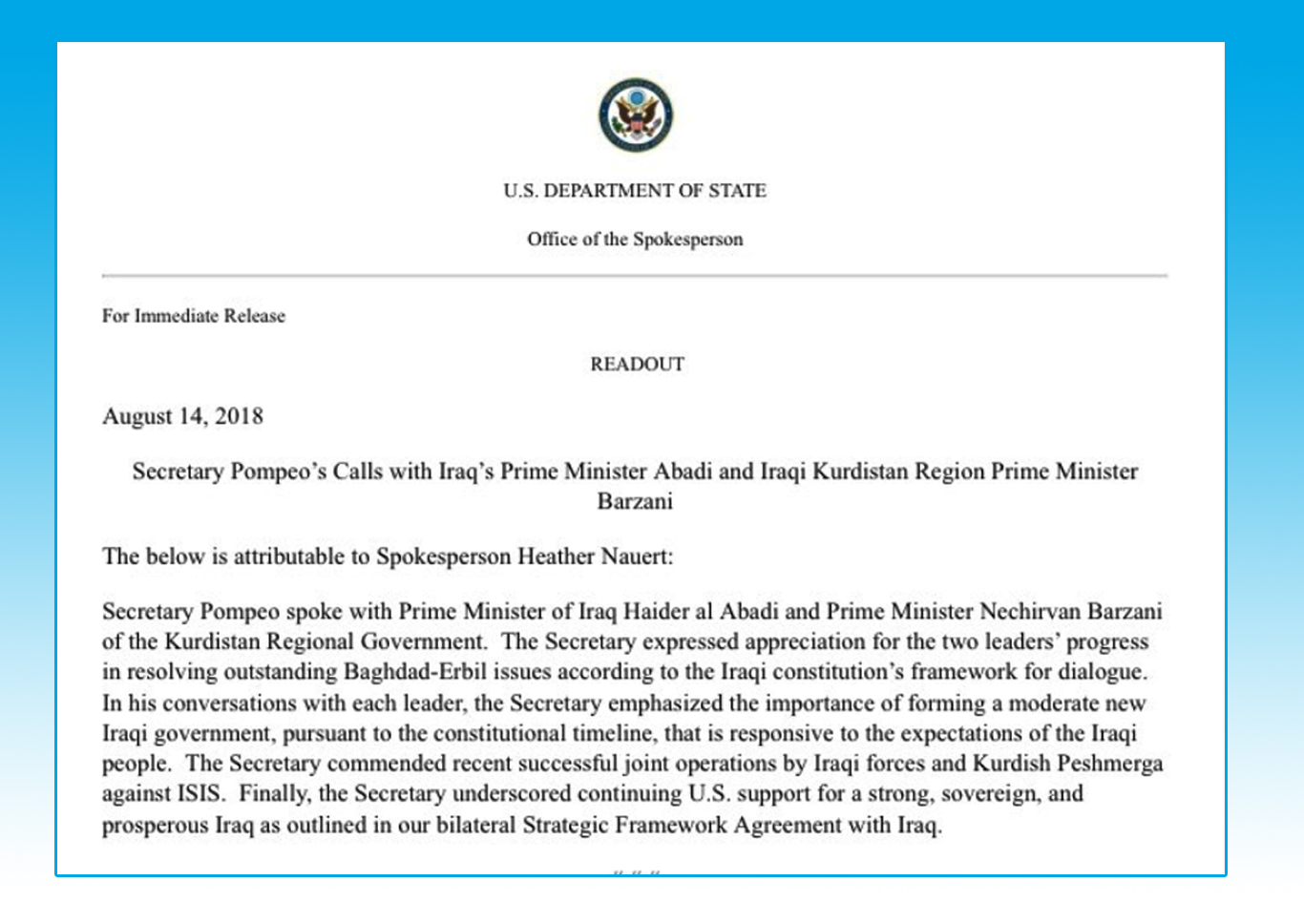 بەیاننامەكەی وەزارەتی دەرەوەی ئاماژەی بەوەشداوە كە مایك پۆمپیۆ ستایشی ئۆپەراسیۆنی سەركەوتوی هاوبەشی هێزەكانی عێراق و پێشمەرگە لەددژی داعش كردووە و جەختیشیكردوەتەوە لەسەر پشتگیری ئەمریكا لە عێراقێكی بەهێز و گەشەسەندوو و خاوەن سەروەریی.