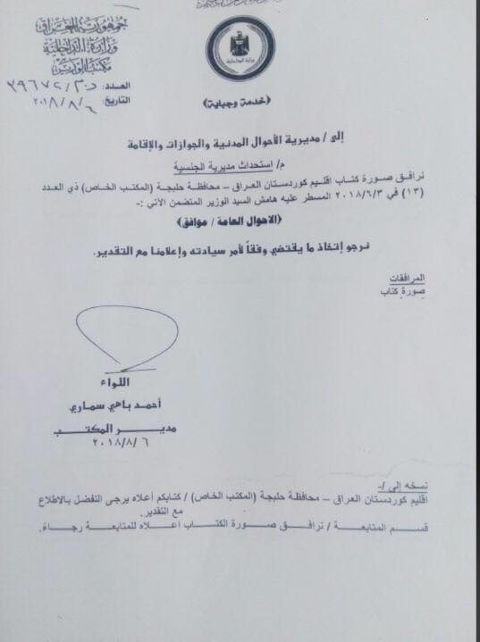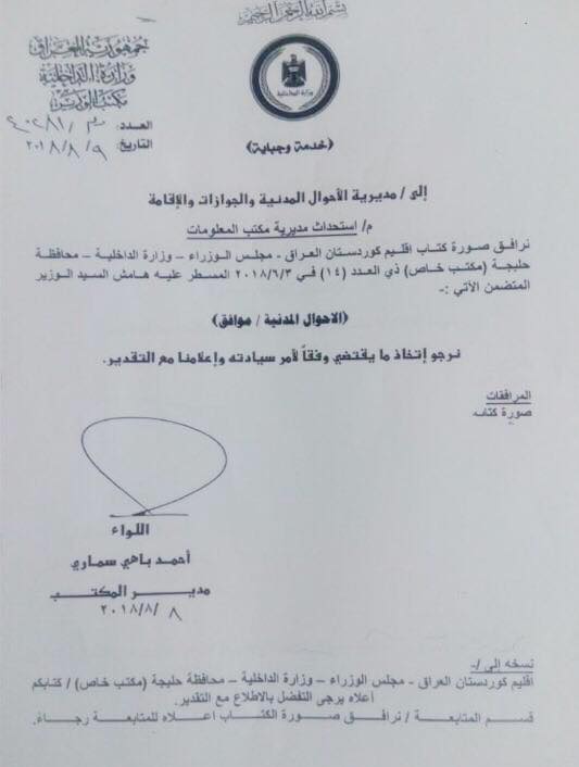 ئامانج رەحیم سكرتێری ئەنجومەنی وەزیرانی حكومەتی هەرێمی كوردستان لە پەیجی رەسمی خۆی سێ نوسراوی وەزارەتی ناوخۆی عێراقی بڵاوكردەوەو نوسیویەتی" ڕەزامەندی فەرمی بەغدا وەرگیرا".