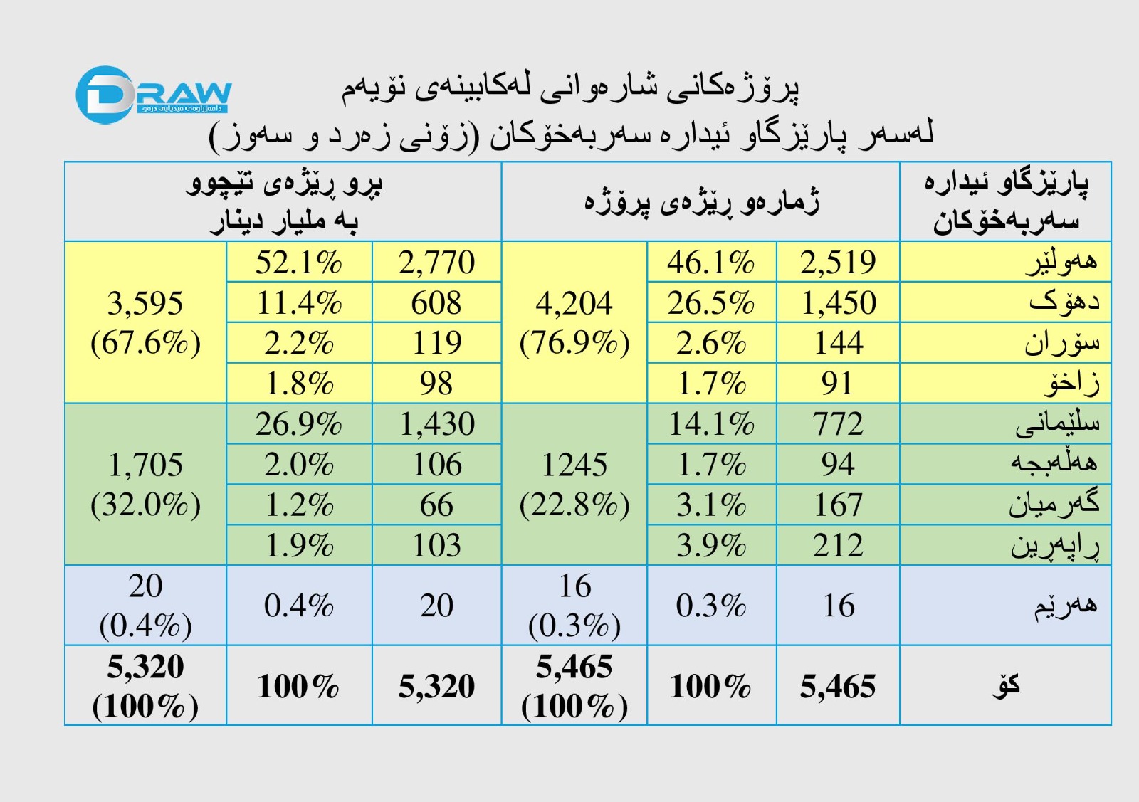 ? (16) پرۆژەیان بە ڕێژەی (0.3%) و بە تێچووی (20 ملیار) دیناری بە ڕێژەی (0.4%)، لەچوارچێوەی هەرێمدان ناکەونە هیچ زۆنێکەوە.