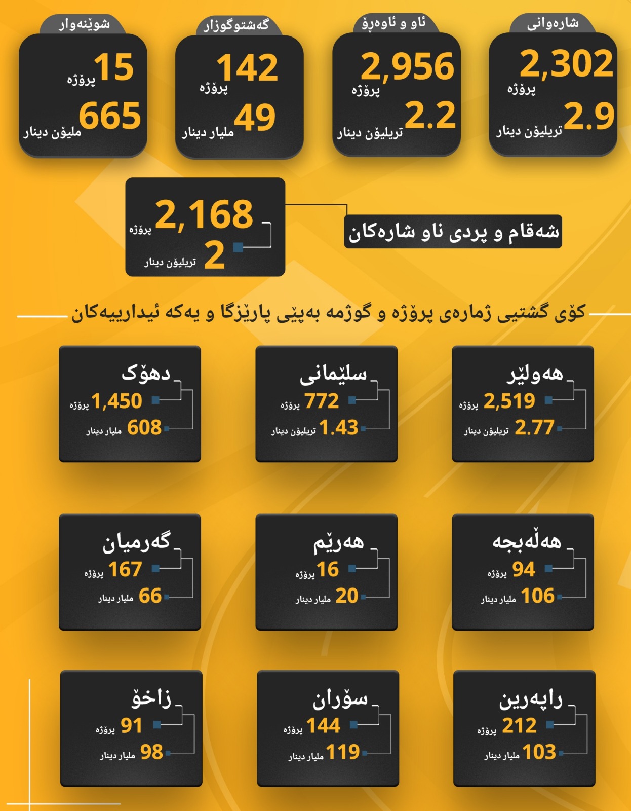 ? (5 هەزار و 465) پرۆژە جێبەجێکراوە، بە تێچووی (5 ترلیۆن و 320 ملیار) دینار.