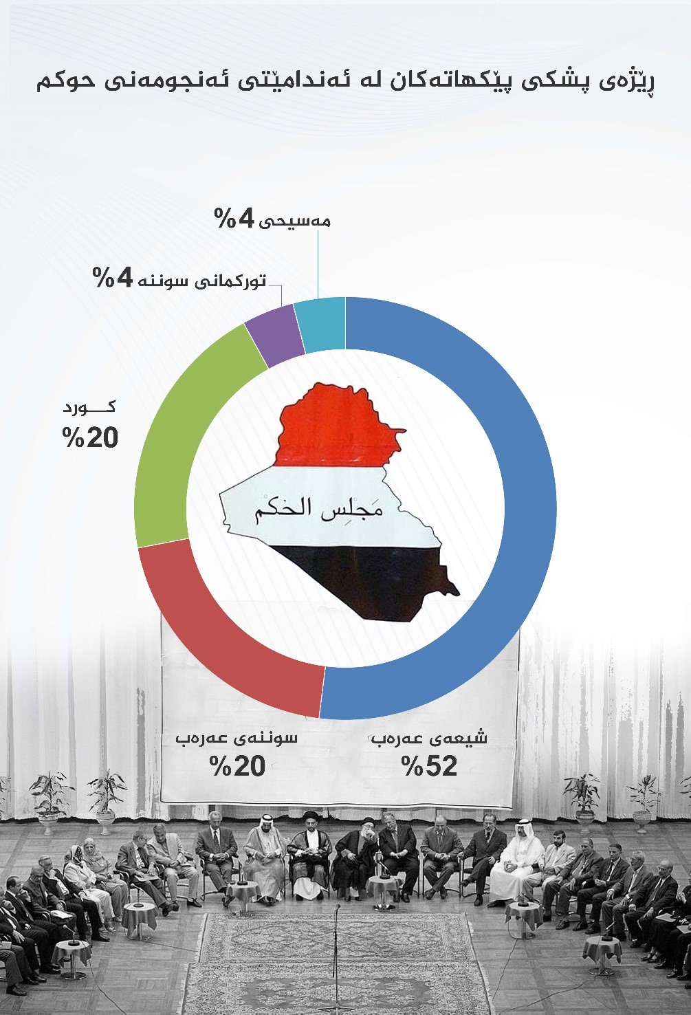 ? نەوشیروان مستەفا؛ بریمهر، له كوردستان به جیا سهردانی تاڵهبانی و بارزانی كرد بوو بۆ ئهوهی قانعیان بكا بهوهی: بهشی كورد له ئەنجومەنی حوکمدا (5) ئهندام بێت، واته پێنجیهك، بهر له جهنگ موعارهزهی عێراقی له ههموو دامودهزگاكاندا چواریهكیان بۆ كورد سهلماند بوو!