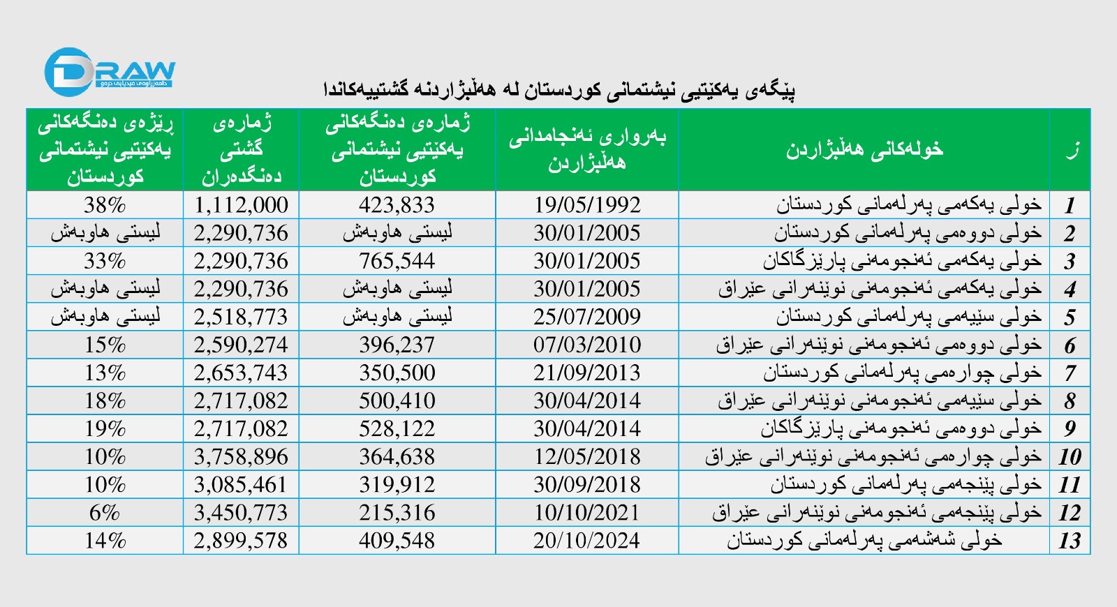 3. لەم هەڵبژاردنەدا (2 ملیۆن و 899 هەزارو 578) كەس مافی دەنگدانی هەبوو، بە ڕێژەی (65%) و (ملیۆنێک و 882 هەزار و 448) کەس لەسەر ئاستی چوار پارێزگاکەی هەرێم بە دروستی دەنگیان دابوو.