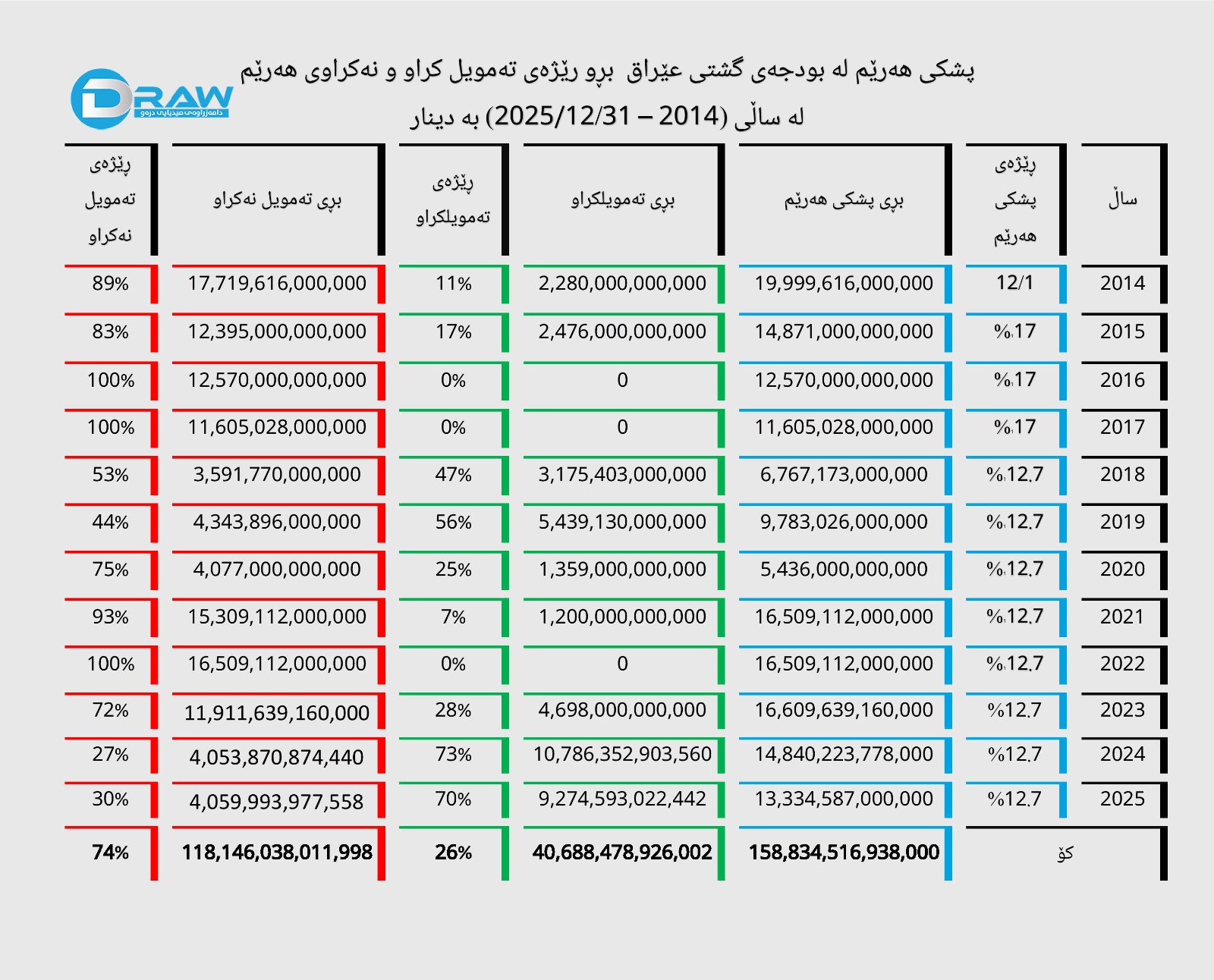? لە ساڵی ماوەی ساڵانی (2014 - 2025)، پشکی هەرێمی کوردستان لە بودجەی گشتی عێراق زیاتر لە (158 ترلیۆن و 834 ملیار) دینار بووە، بڕی زۆرتر لە (40 ترلیۆن و 688 ملیار) دیناری بەڕێژەی (26%)ی ڕەوانەی هەرێم کراوە، بڕی زیاتر لە (118 ترلیۆن و 146 ملیار) دیناری بە ڕێژەی (74%)ی ڕاگراوە.