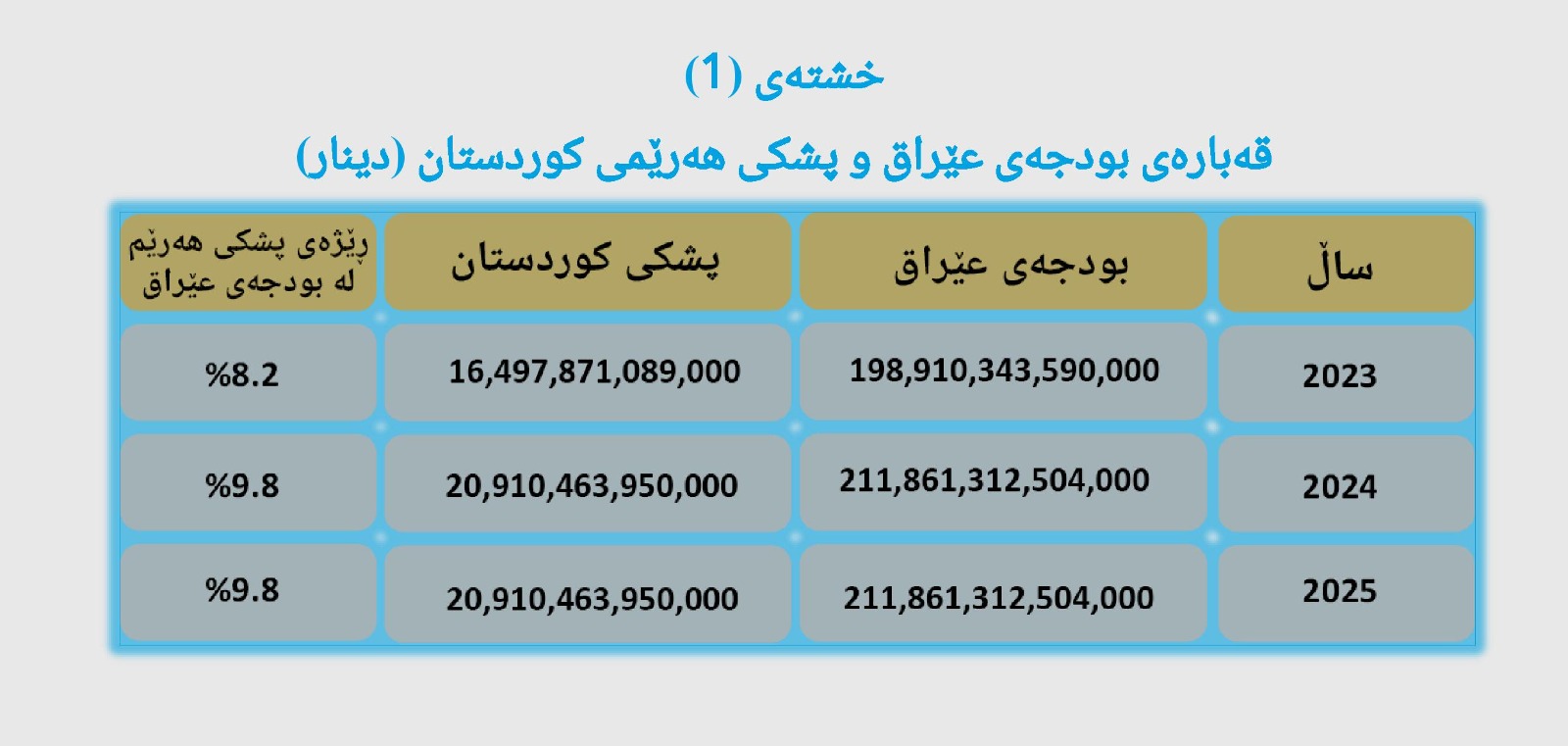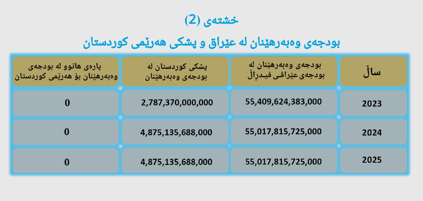 لەدوای پەسەندکردنی یاسای بودجەی گشتیی فیدڕاڵیی عێراق لە 21ـی حوزەیرانی ساڵی 2023 کە بۆ هەر سێ ساڵی دارایی (2023 – 2024 – 2025) لەخۆ گرتبوو، تیایدا پشکی هەرێمی کوردستان دوای چەندین گفتوگۆ و لێکتێگەیشتن لەنێوان شاندی حکومەتی هەرێمی کوردستان و حکومەتی فیدڕاڵیی عێراق، ئەم یاسایە پەسەند کرا، لە یاساکە پشکی هەرێمی کوردستان دیاری کراوە بە مەرجی ناردنی داهاتی نانەوتی بە گوێرەی یاسای بەڕێوەبردنی دارایی و پێدانی نەوتی بەرهەمهێندراو بە کۆمپانیای بەبازاڕکردنی نەوتی عێراق (سۆمۆ) یاخود وەزارەتی نەوتی عێراقی فیدڕاڵ، لەبەرامبەر ئەمەشدا حکومەتی فیدڕاڵیی عێراق، دەبێت پشکی هەرێمی کوردستان خەرج بکات بەگوێرەی یاسای بودجەی گشتیی فیدڕاڵی، بەڵام لە تەواوی ئەو سێ ساڵەدا ئەو بڕەپارەیە بۆ هەرێمی کوردستان نەنێردراوە کە لە یاسای بودجە دیاری کرابوو. (خشتەی1)