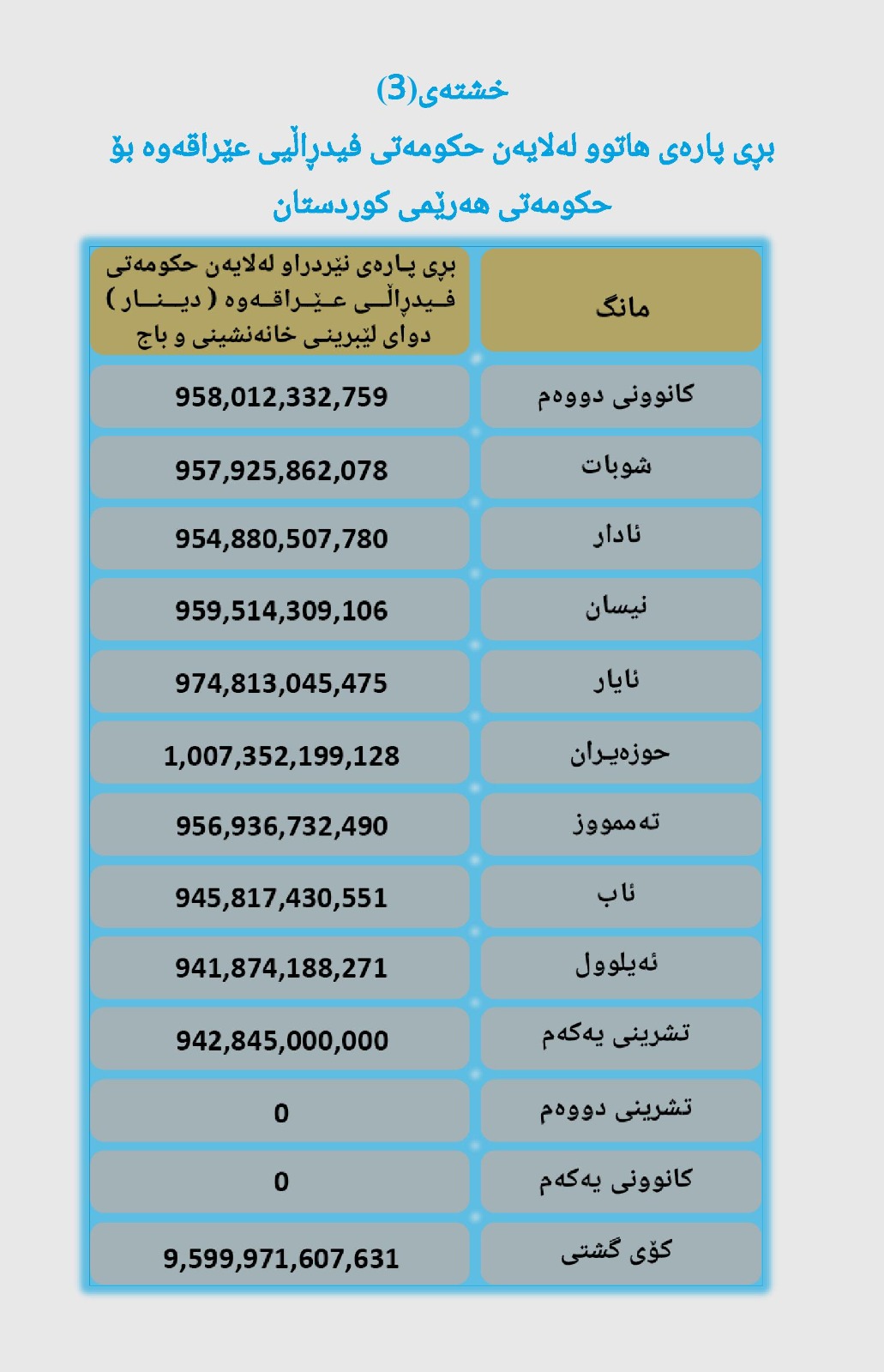 لە ساڵی 2025ـدا، کۆی گشتیی پارەی خەرجکراو بۆ هەرێمی کوردستان لەلایەن حکومەتی فیدڕاڵییەوە بریتی بووە لە 10,414,555,154,731 دینار. لەم بڕەدا، دوای لێدەرکردنی لێبڕینی بڕی 814,486,145,690 دینار (لێبڕینی خانەنشینی، باجی لێبڕینی مووچە، ڕەسمی پوول، کردنەوەی ژمارەی وەزیفی و گەڕاندنەوەی قەرزی لە %3ـی خانەنشینان)، کۆی پارەی نێردراوی ماوە بۆ مووچەی مووچەخۆرانی هەرێمی کوردستان 9,599,971,607,631 دینار بووە بۆ 10 مانگ. هەروەها بەگوێرەی ڕێککەوتنی هەردوو شاندی وەزارەتی دارایی هەرێم و حکومەتی فیدڕاڵی، بڕی تەرخانکراوی مووچە بۆ هەرێمی کوردستان لە ساڵی 2025 بریتی بووە لە 13,334,587,000,000 دینار، کە وەزیری داراییی عێراقی فیدڕاڵ لە پشکی هەرێمی کوردستان بۆ مووچەی مووچەخۆرانی هەرێمی کوردستانی تەرخان کرد، بەڵام لەمساڵدا تەنها بڕی 9.6 تریلیۆن دینار بۆ حکومەتی هەرێم نێردراوە. ئەمە لە کاتێکدا بەگوێرەی یاسای بودجەی گشتی، پشکی هەرێمی کوردستان لە ساڵی 2025 بریتییە لە 20,910,463,950,000 دینار، بەمەش حکومەتی فیدڕاڵی لە ماوەی ئەمساڵەدا تەنها 45%ـی پشکی هەرێمی کوردستانی ناردووە. بەمەش لە کۆی 12 مووچەی ساڵی 2025، تەنها پارەی 10 مووچەی خەرج کردووە و ناردوویەتی بۆ حکومەتی هەرێمی کوردستان. (خشتەی3)