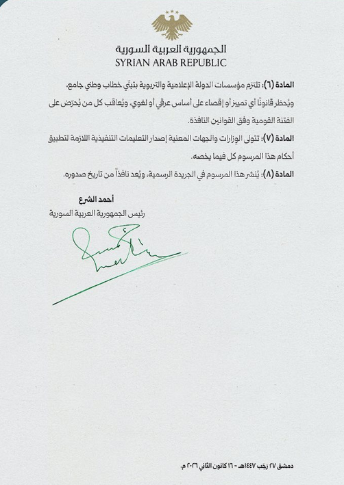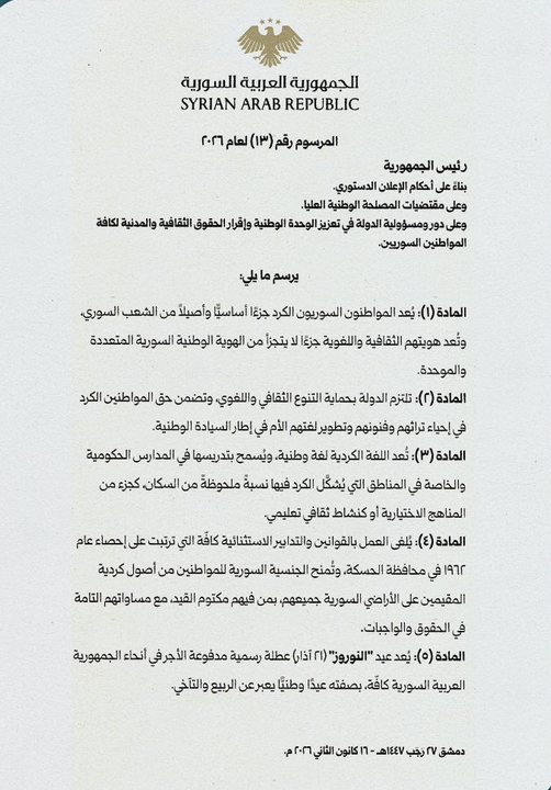 ئەحمەد شەرع سەرۆکی كاتی سووریا مەرسوومێکی کۆماریی دەرکرد، کە تێیدا دان دەنێت بەوەی کورد پێکهاتەیەکی ڕەسەنی سووریایە، زمانی کوردی وەک زمانێکی نیشتمانی دەناسێنێت،جەژنی نەورۆز و 21ی ئازار وەك پشووی رەسمی راگەیاندووە