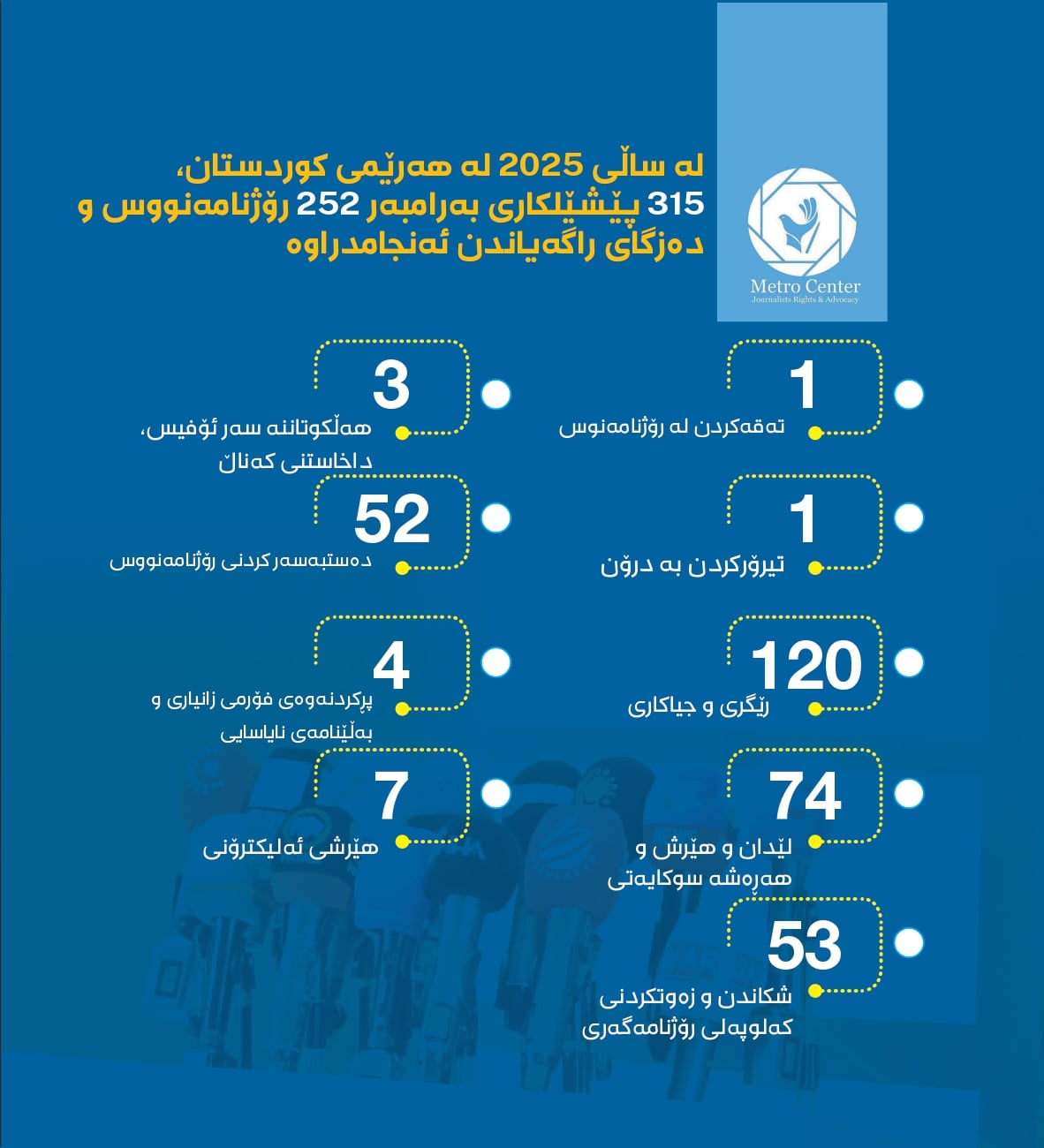 دوێنێ سەنتەری میترۆ لە سلێمانی بڵاویكردەوە: لە ساڵی رابردوودا (315) پێشێلكاری بەرامبەر بە (252) رۆژنامەنووس و دەزگای راگەیاندن كراوە.