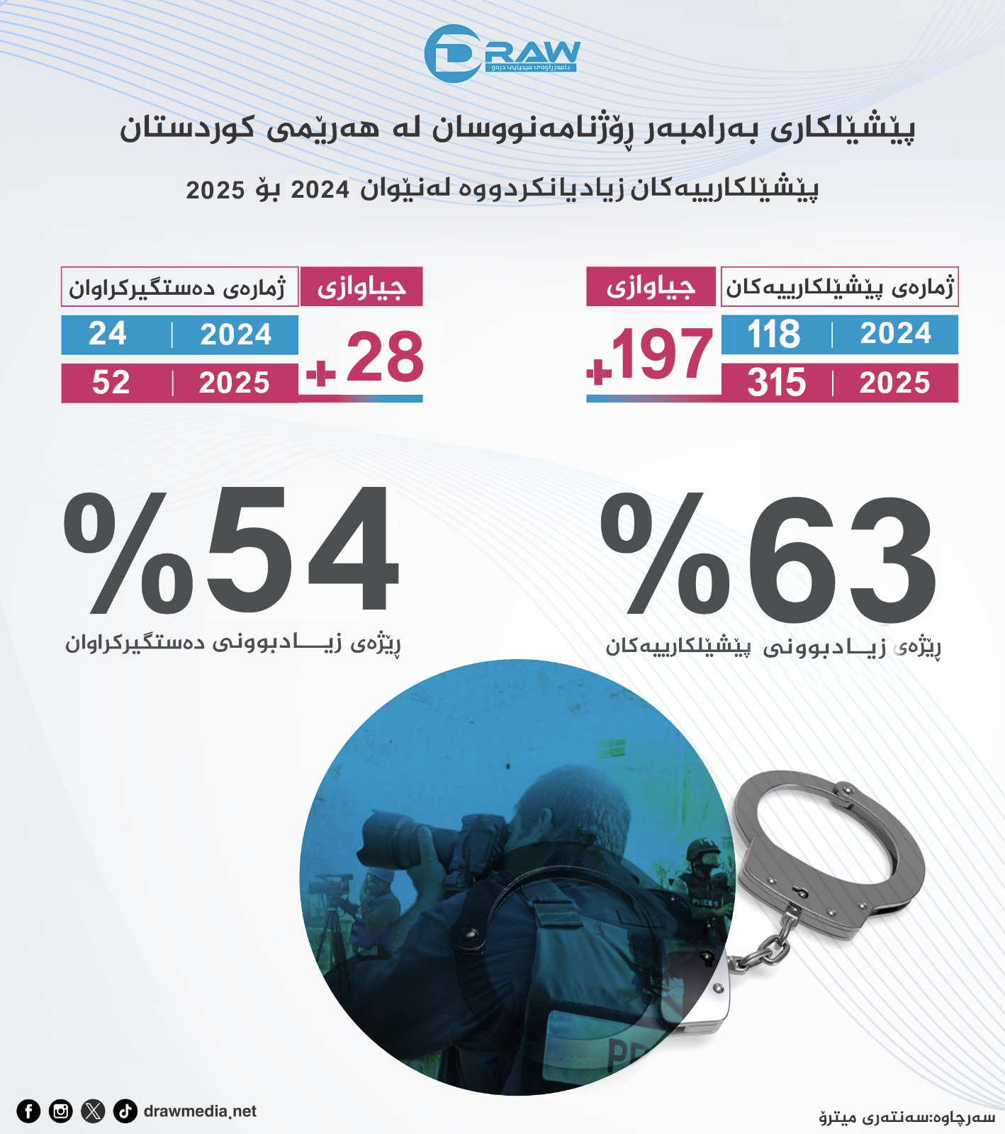 دیاری محەمەد بەڕێوەبەری سەنتەری میترۆ بڵاویكردووەتەوە كە تەنیا لە یەك رۆژدا (9ی شوباتی 2025) لە خۆپیشاندانی مامۆستایان لە دێگەڵە (59) پێشێلكاری بەرامبەر بە (36) رۆژنامەنووس و (2) دەزگای راگەیاندن كراوە.