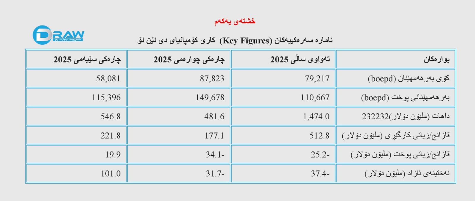 تێکڕای بەرهەمهێنان: کۆی بەرهەمهێنانی گشتی لە مۆڵەتی "تاوکێ" کە لەلایەن DNOـەوە سەرپەرشتی دەکرێت و کێڵگەکانی (تاوکێ و پێشخابوور) لەخۆ دەگرێت، لە چارەکی چوارەمی ساڵی 2025دا گەیشتە 77,268 بەرمیل نەوت لە ڕۆژێکدا (لە کاتێکدا لە چارەکی سێیەمی 2025دا 46,572 بەرمیل بووە). ئاستی بەرهەمهێنان بە ڕێژەی %66 بەراورد بە چارەکی پێشوو زیادی کردووە، ئەمەش دوای ئەوەی کۆمپانیاکە توانی بە شێوەیەکی پلەبەندی توانای بەرهەمهێنان بگەڕێنێتەوە کە بەهۆی هێرشە درۆنییەکانی ناوەڕاستی ساڵی 2025وە کەم ببووەوە. لەم ماوەیەدا، کێڵگەی تاوکێ 29,095 بەرمیل و کێڵگەی پێشخابوور 48,173 بەرمیلیان لە ڕۆژێکدا بەرهەم هێناوە.